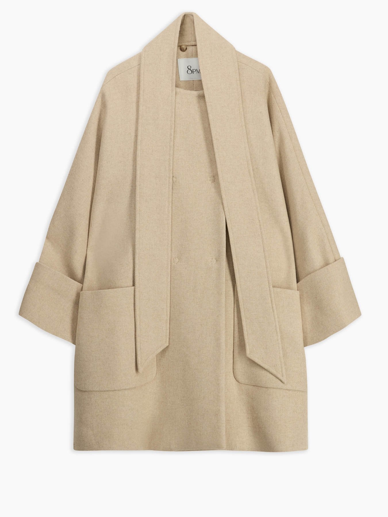 Wool coat, round neckline, two patch pockets on the front, sleeves with wide turn-up, detachable sash in its fabric, oversized fit