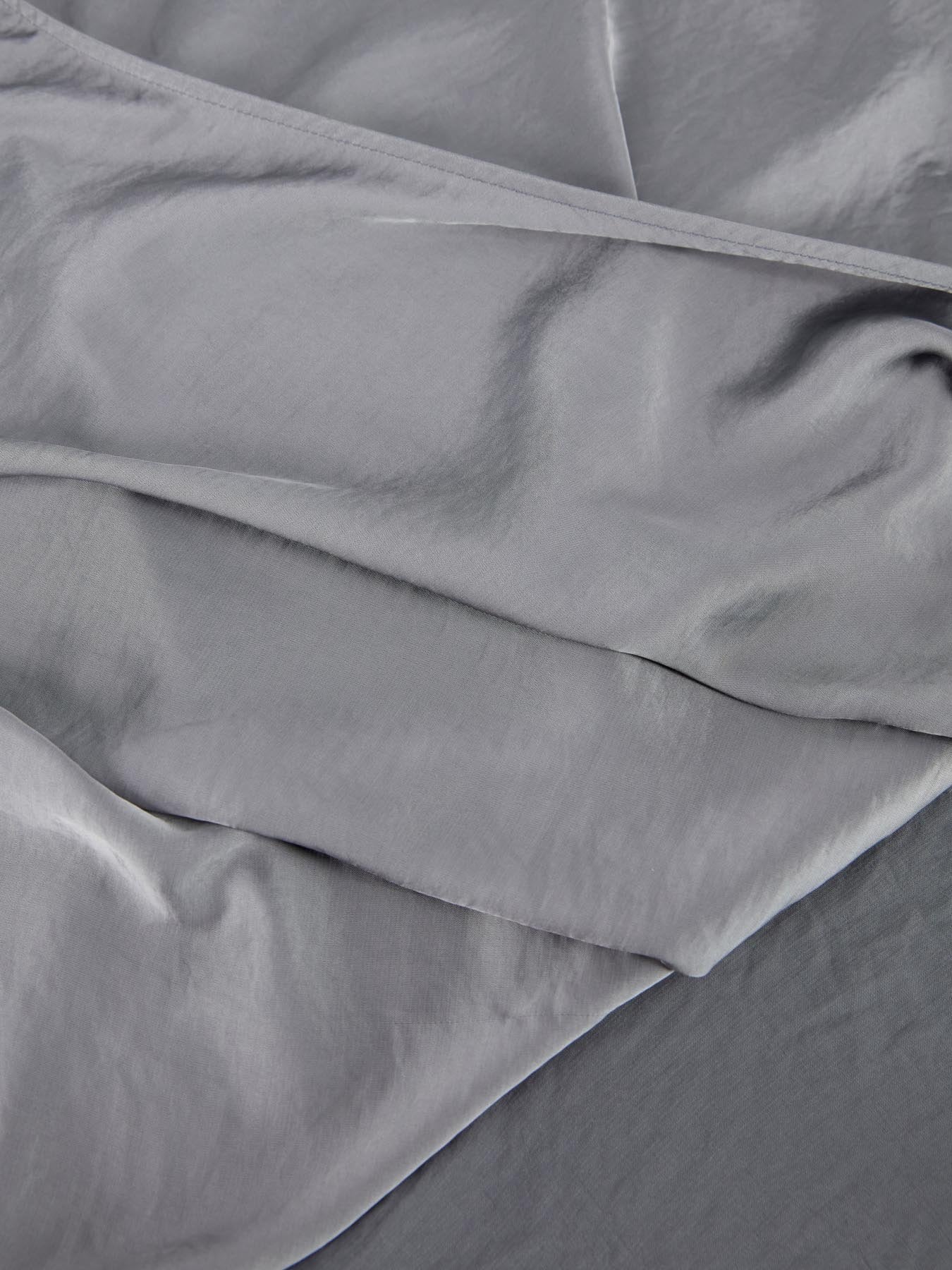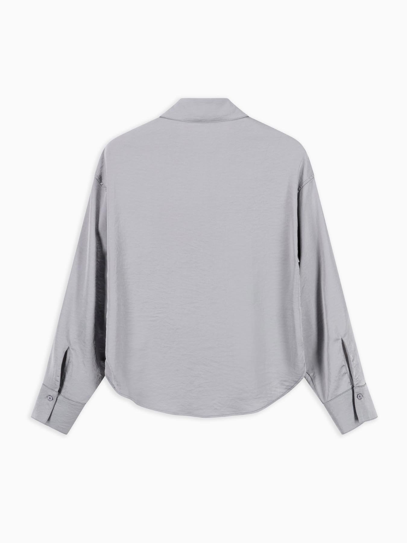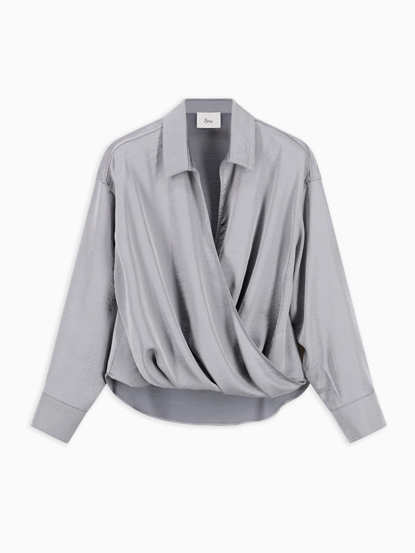 Long-sleeved satin shirt, front neckline with crisscross and reimbursement at the waist, loose fit in the back