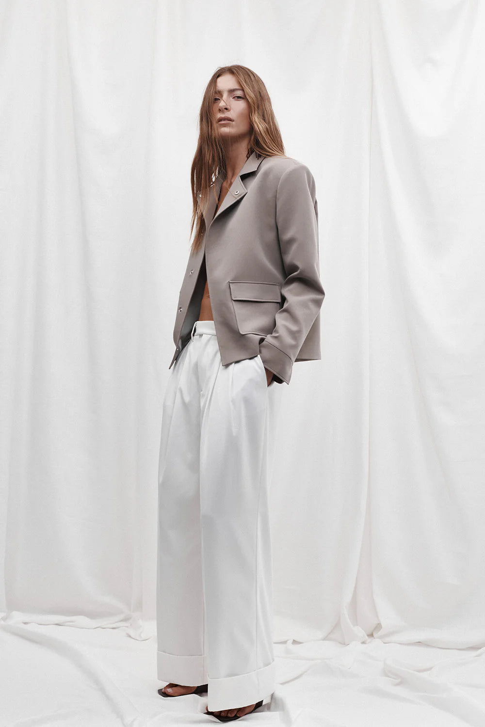 A tailored take on utility, the Bianca Jacket is crafted from a smooth suiting fabrication and features an angular concealed snap-button front, dual flap pockets, and a fully lined interior.