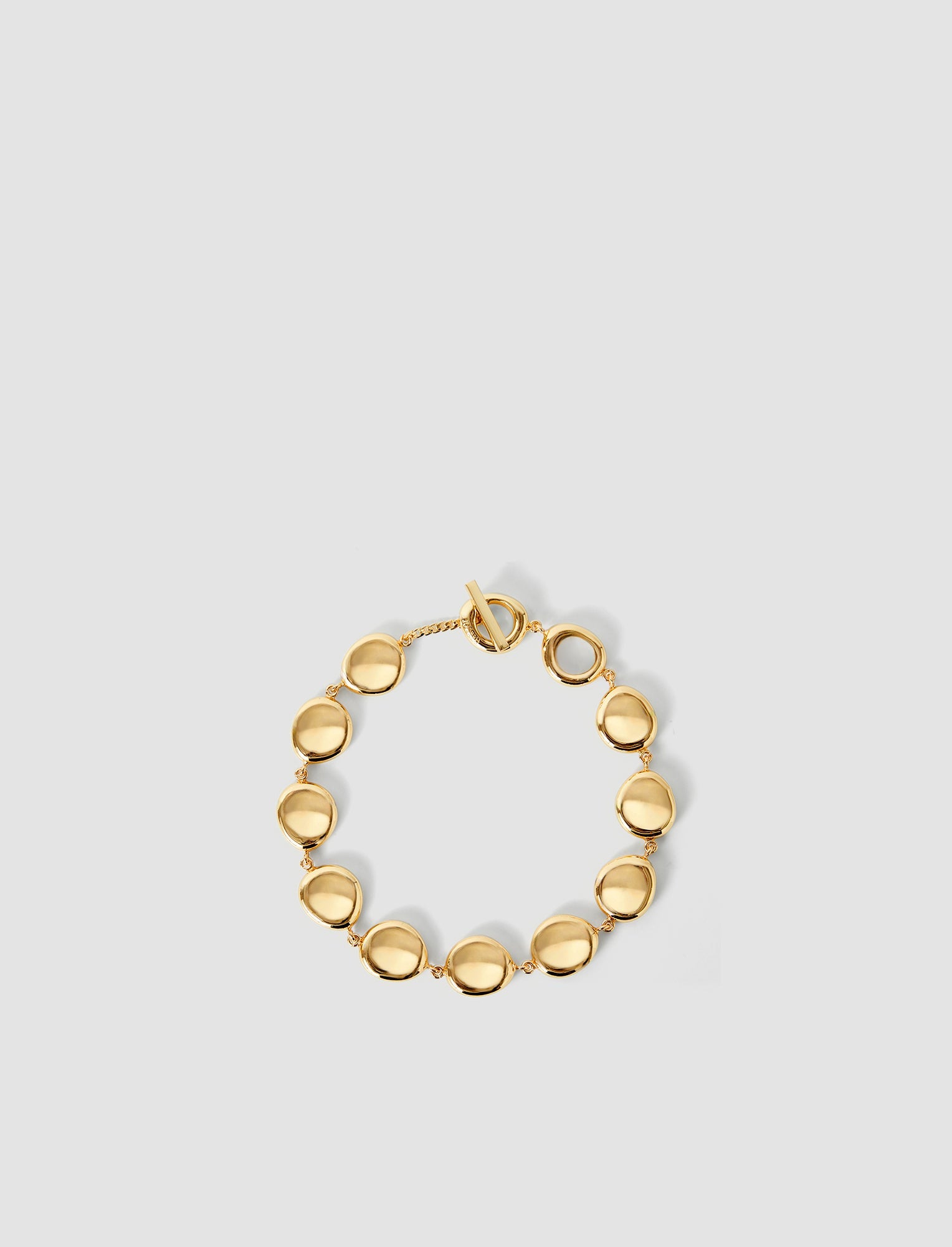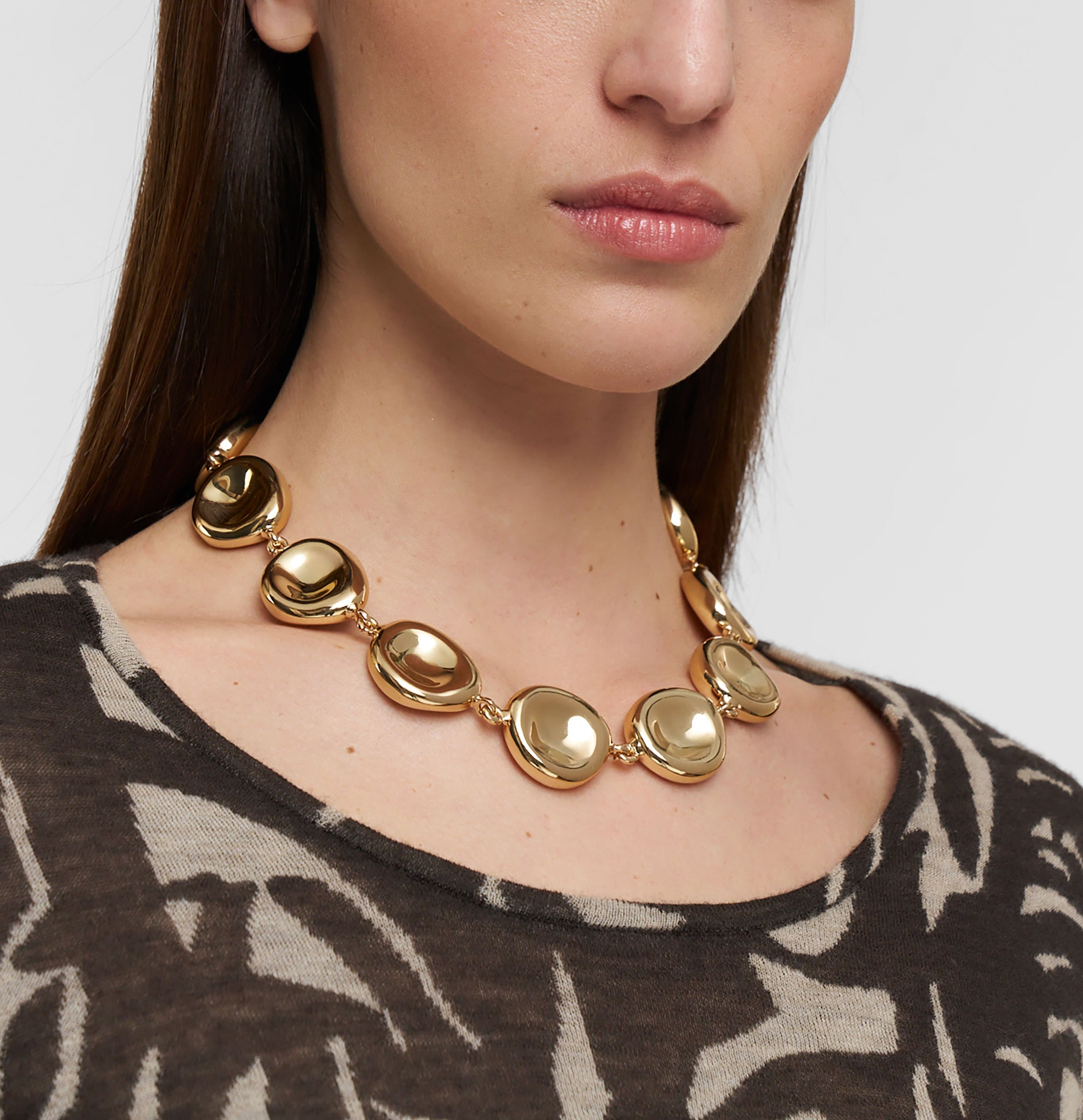 The Bean Link Necklace features chunky interlocking links in a gold-tone finish. It’s a fluid design secured with a toggle clasp. The ‘bean’ is an exclusive studio-designed organic shape, appearing in various forms across the collection.