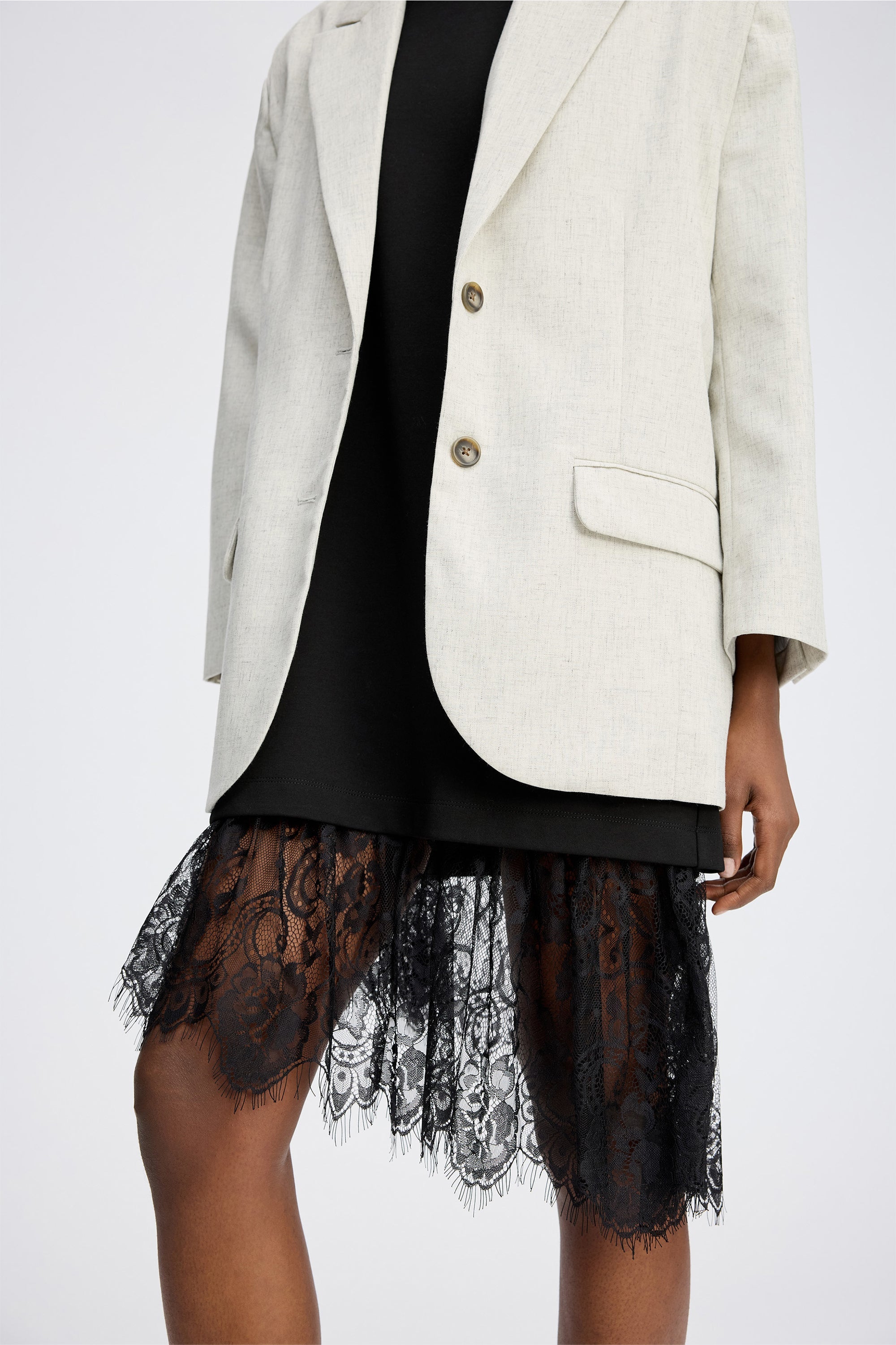 Elegant and versatile style featuring a short-sleeved T-shirt and a loose, lightweight top with an asymmetrical lace hem. The T-shirt can be worn on its own for a simple everyday look, while the lace top adds a feminine touch – wear them together or separately.
