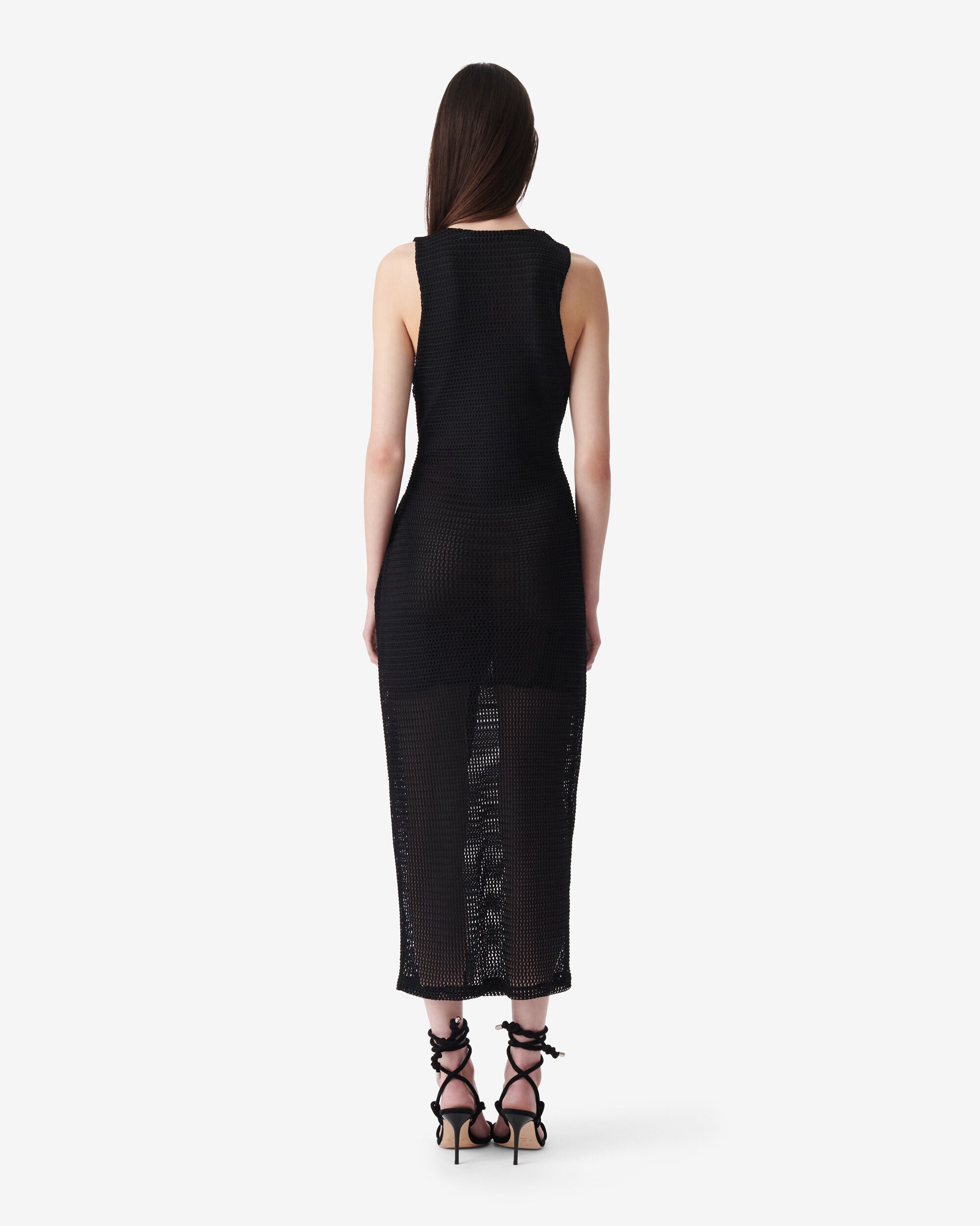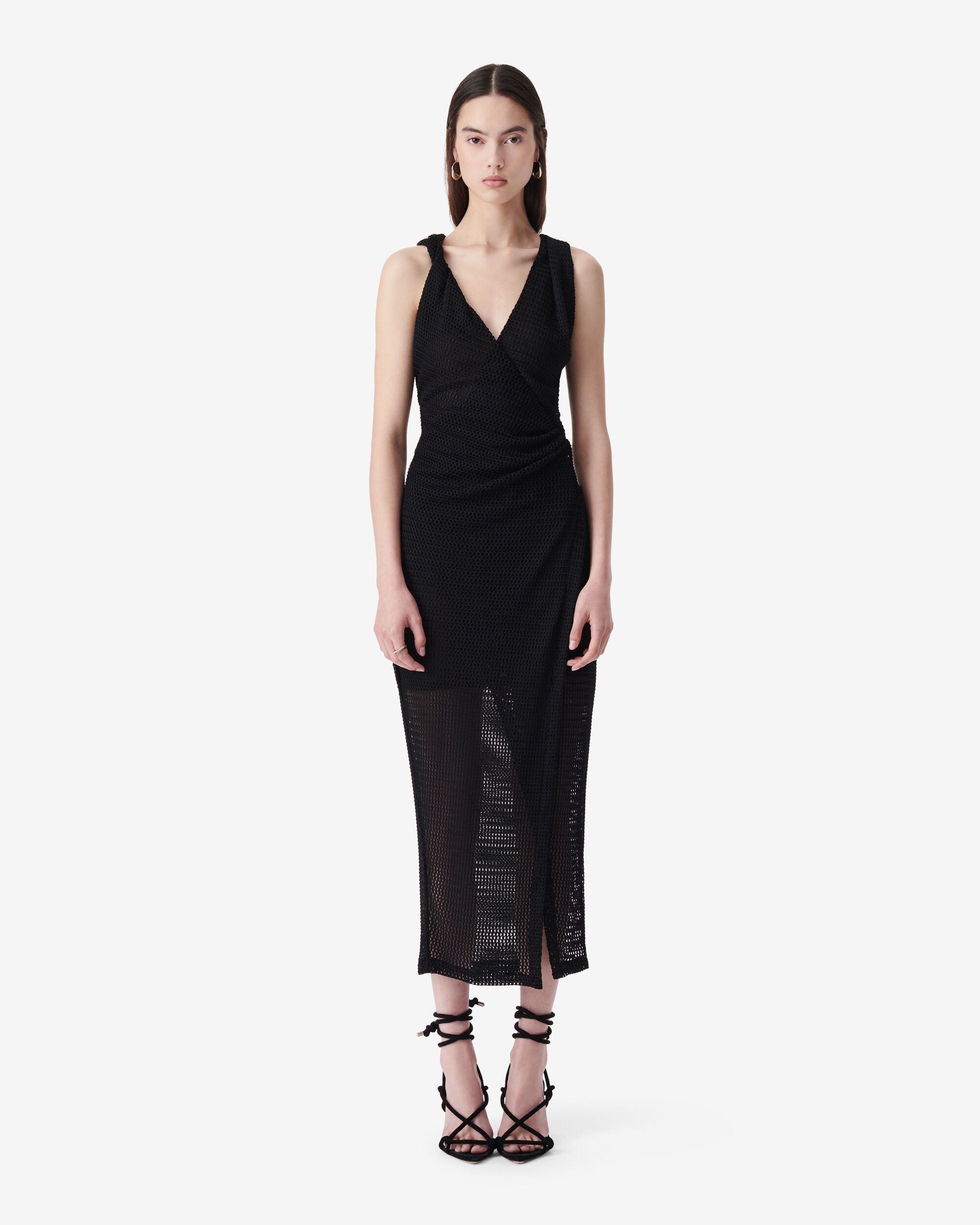 TIA knit maxi dress. Portfolio cut with twisted shoulder and gathered details.