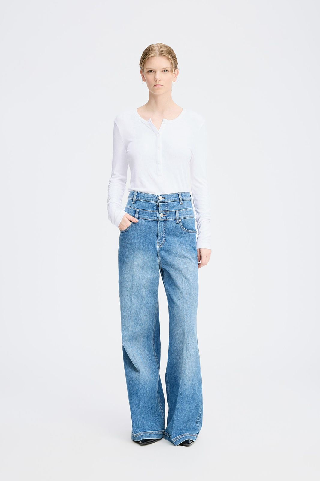 High-waisted jeans with contrast stitching. These jeans are designed with a beautiful MUNTHE emblem on the back pocket, wide legs, belt loops, pockets, and an elegant double button fastening.