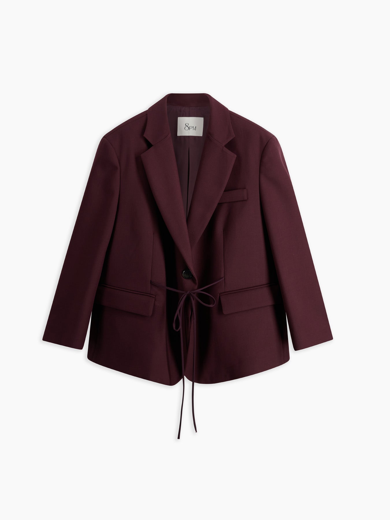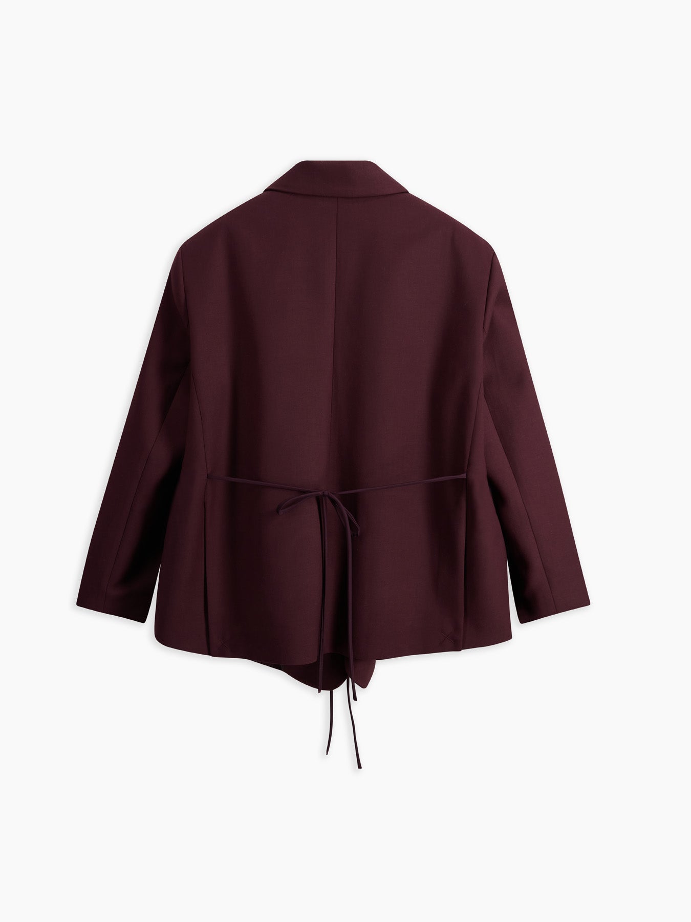 oversized single-breasted jacket in plain fabric Polyamide/Viscose/Elasthane, two front pockets with flap, upper welt pocket, tie for front and back closure, horn-effect button, back slits