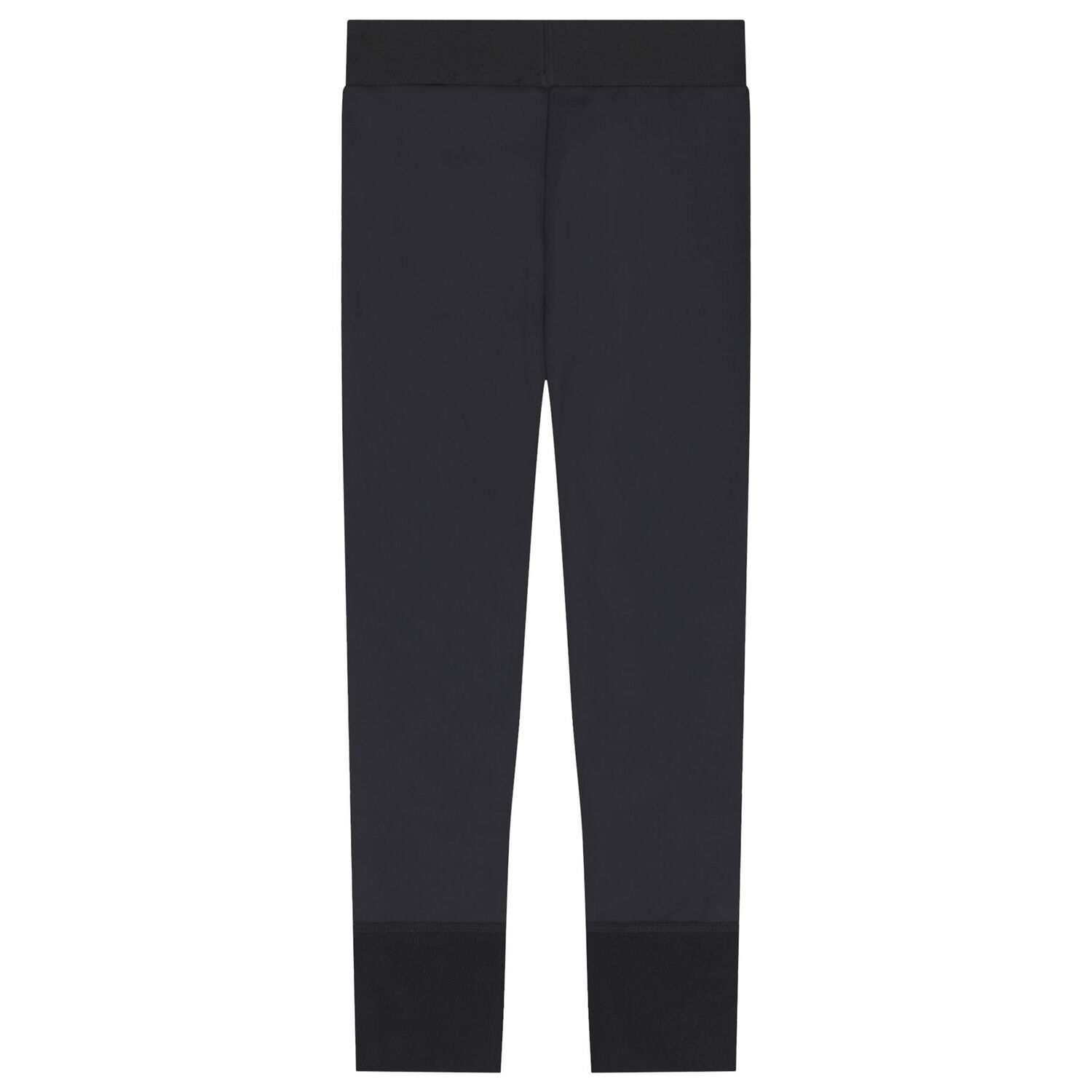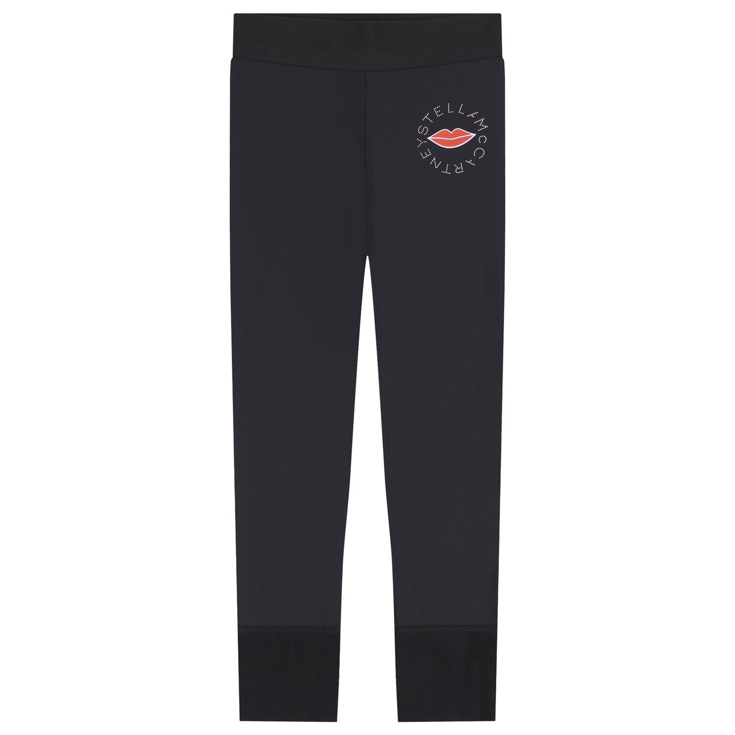 Black leggings for girls by British designer Stella McCartney. Made from soft, stretchy fabric, they feature a circular logo with a red lip print on the front and are finished with a black elasticated waistband for a stylish yet comfortable fit.
