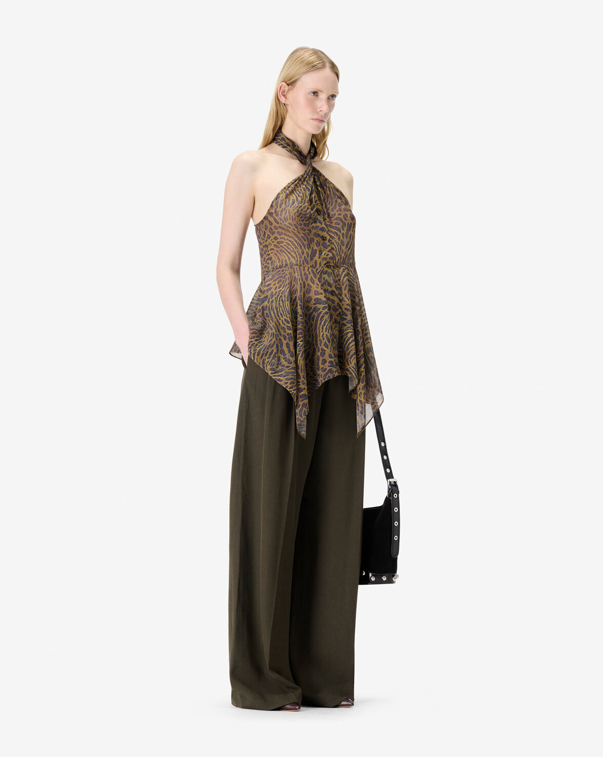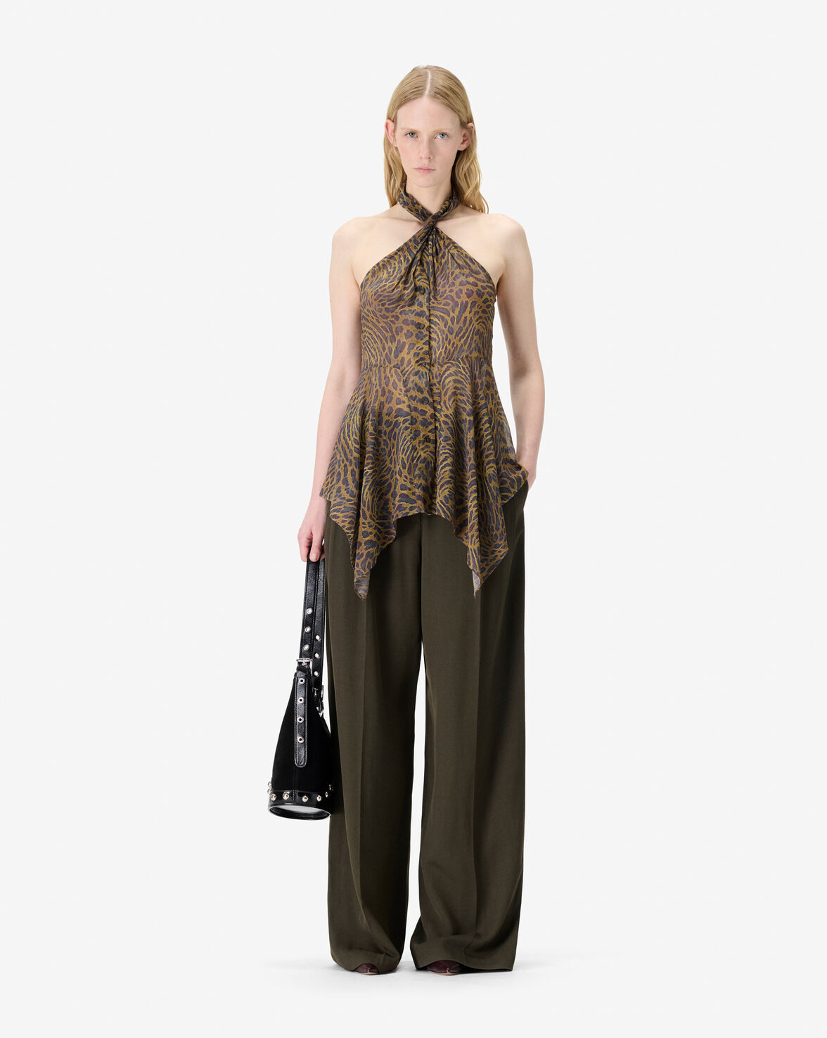 CASSIAN leopard print sleeveless top. Twisted effect on neckline and long pannels on front.