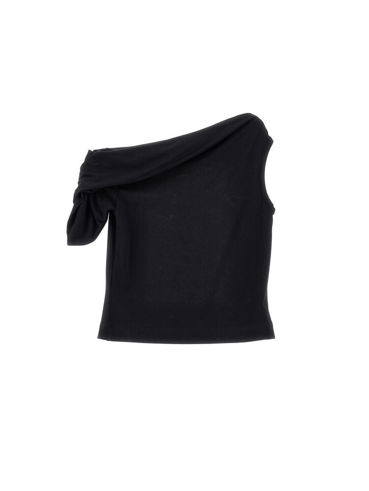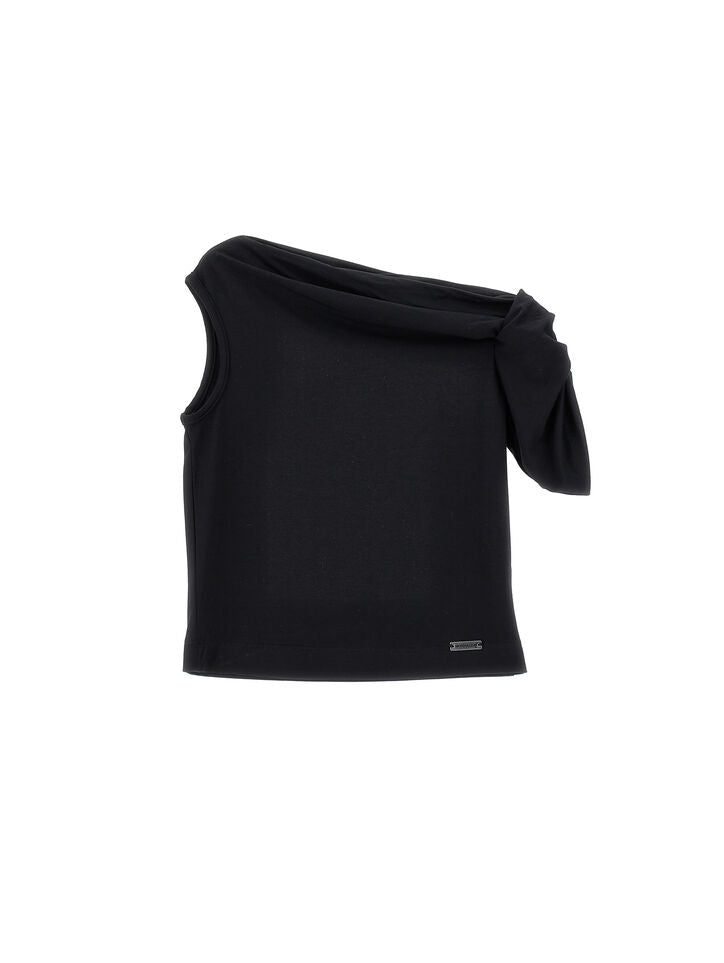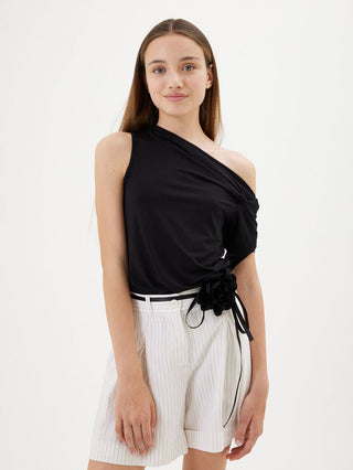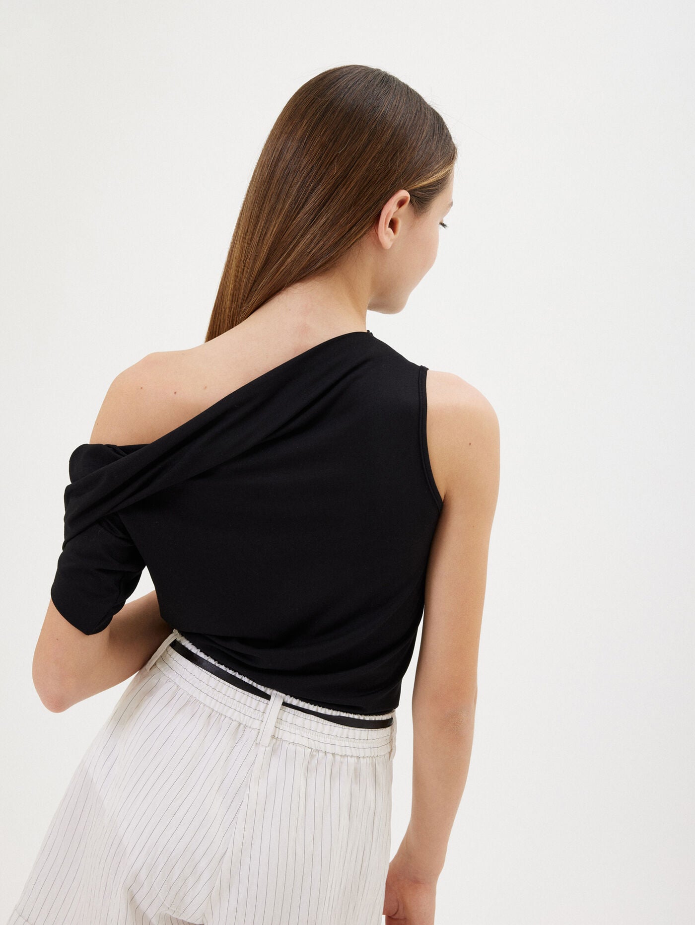 A fashionable alternative to the T-shirt, the asymmetrical, low-cut top with exposed shoulders will appeal to teenagers.