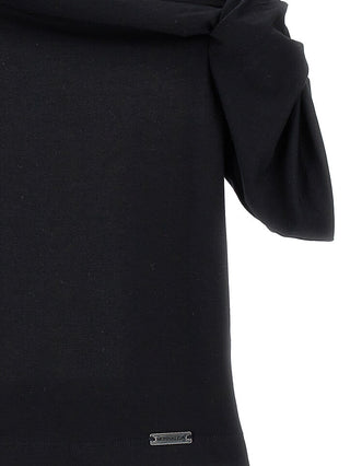 • Slightly cropped line, logo plate, asymmetrical gathering at the neckline