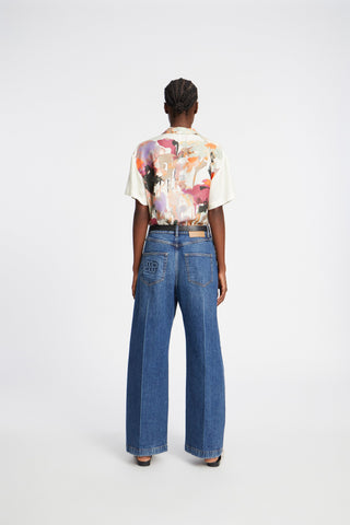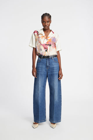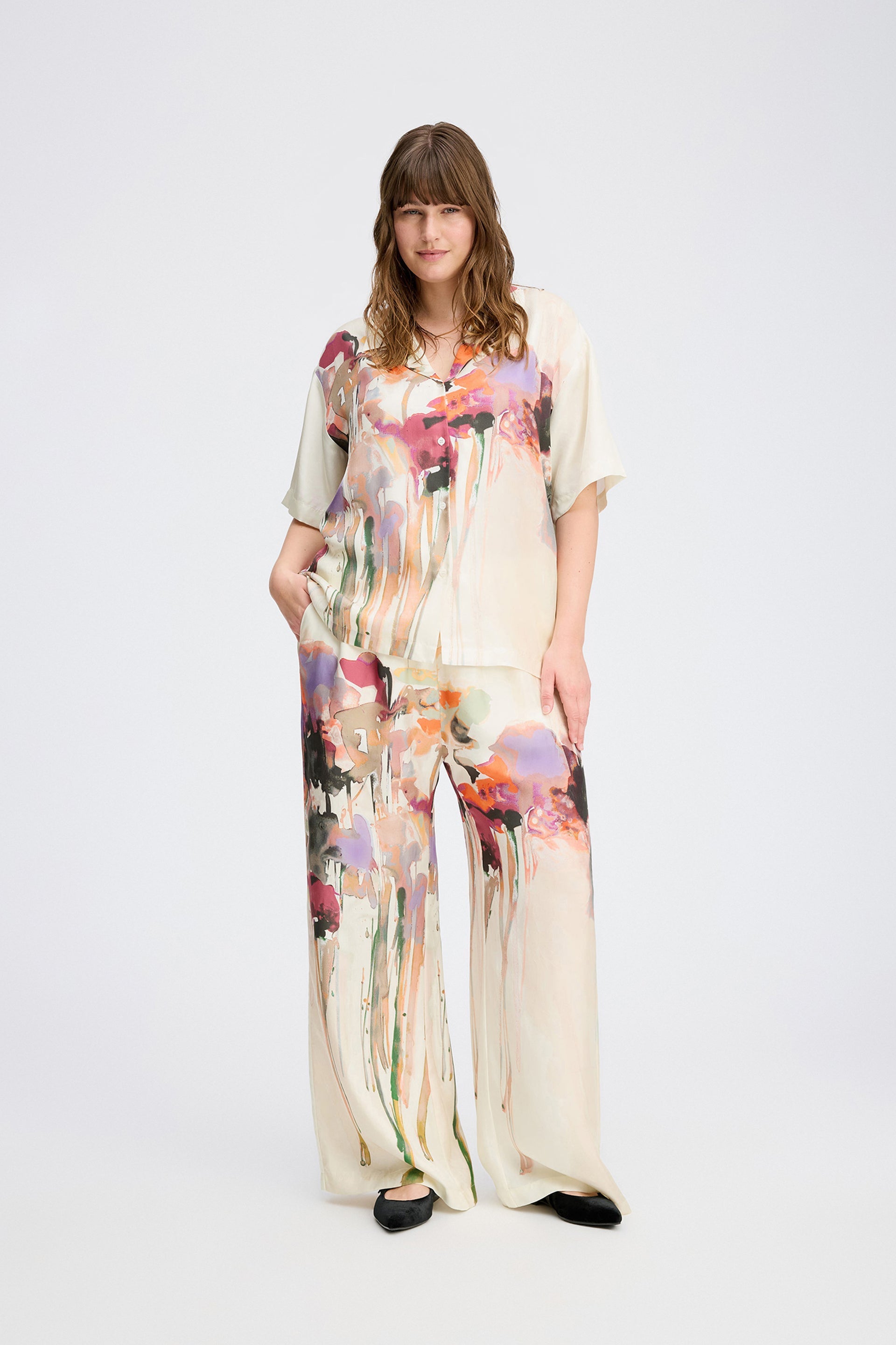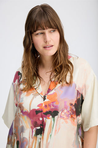 A beautiful shirt with an elegant art print. This shirt is made of 100% silk, and has short sleeves and a small collar with a nice button closure detail at the top of the collar. The shirt is designed for a loose fit.