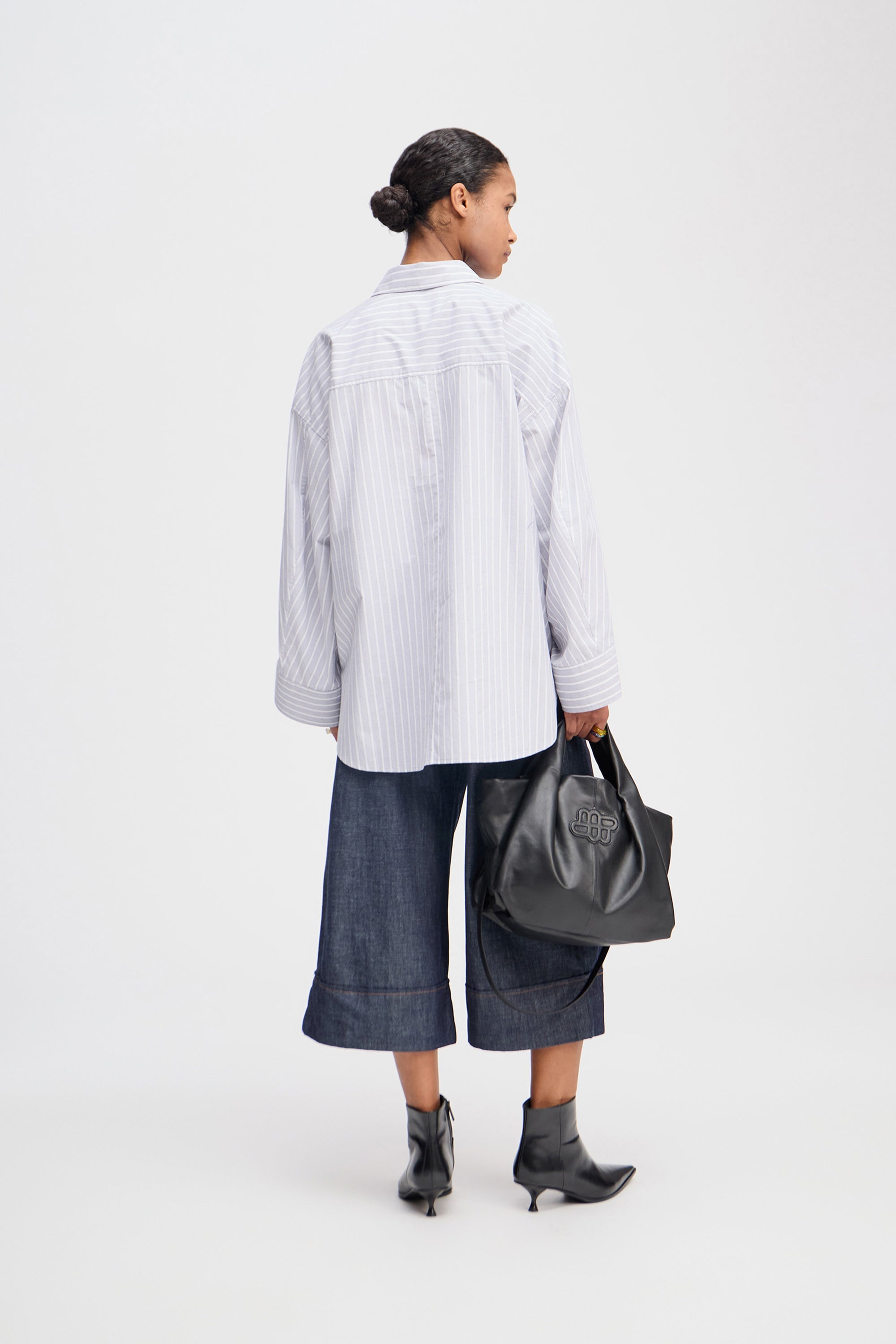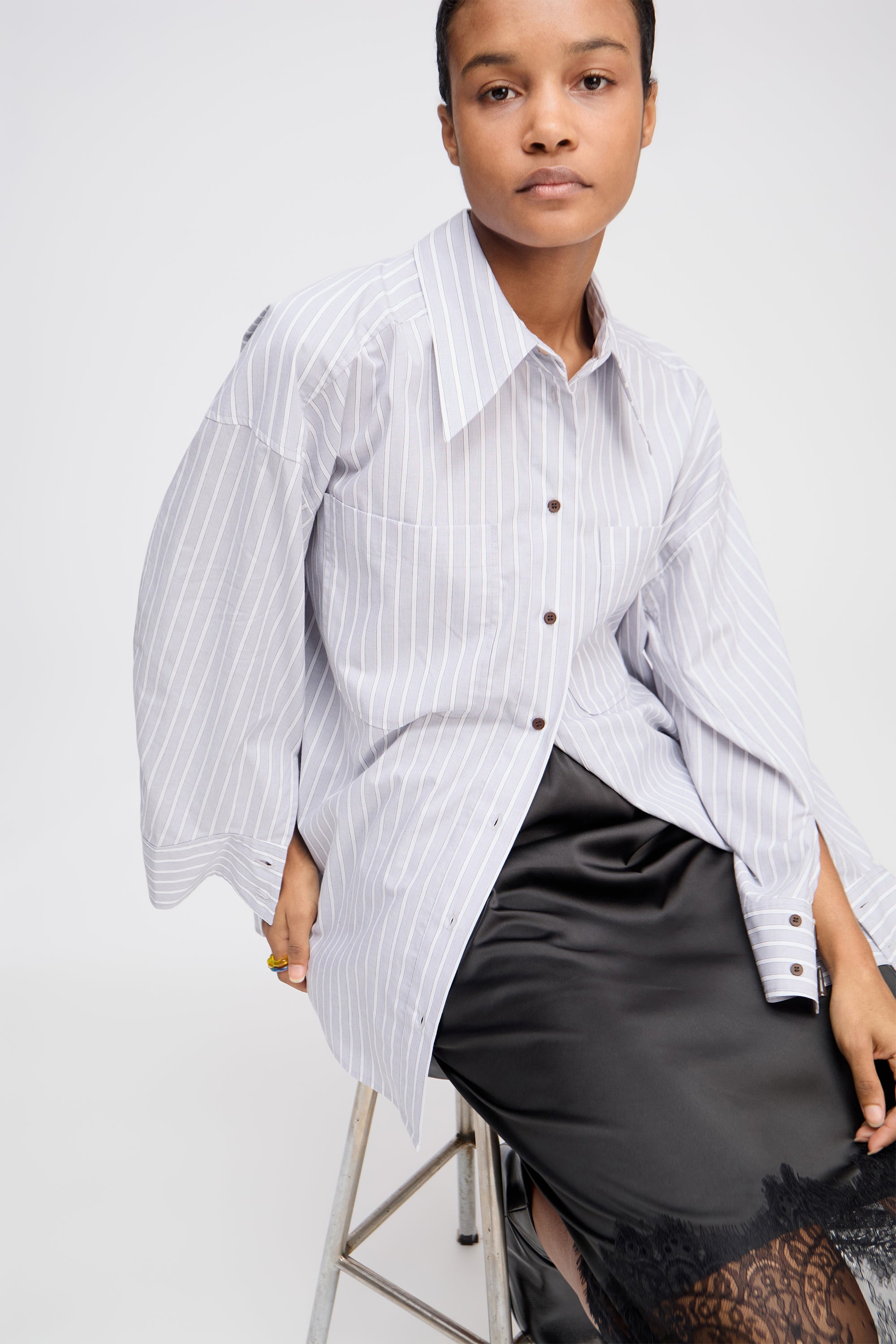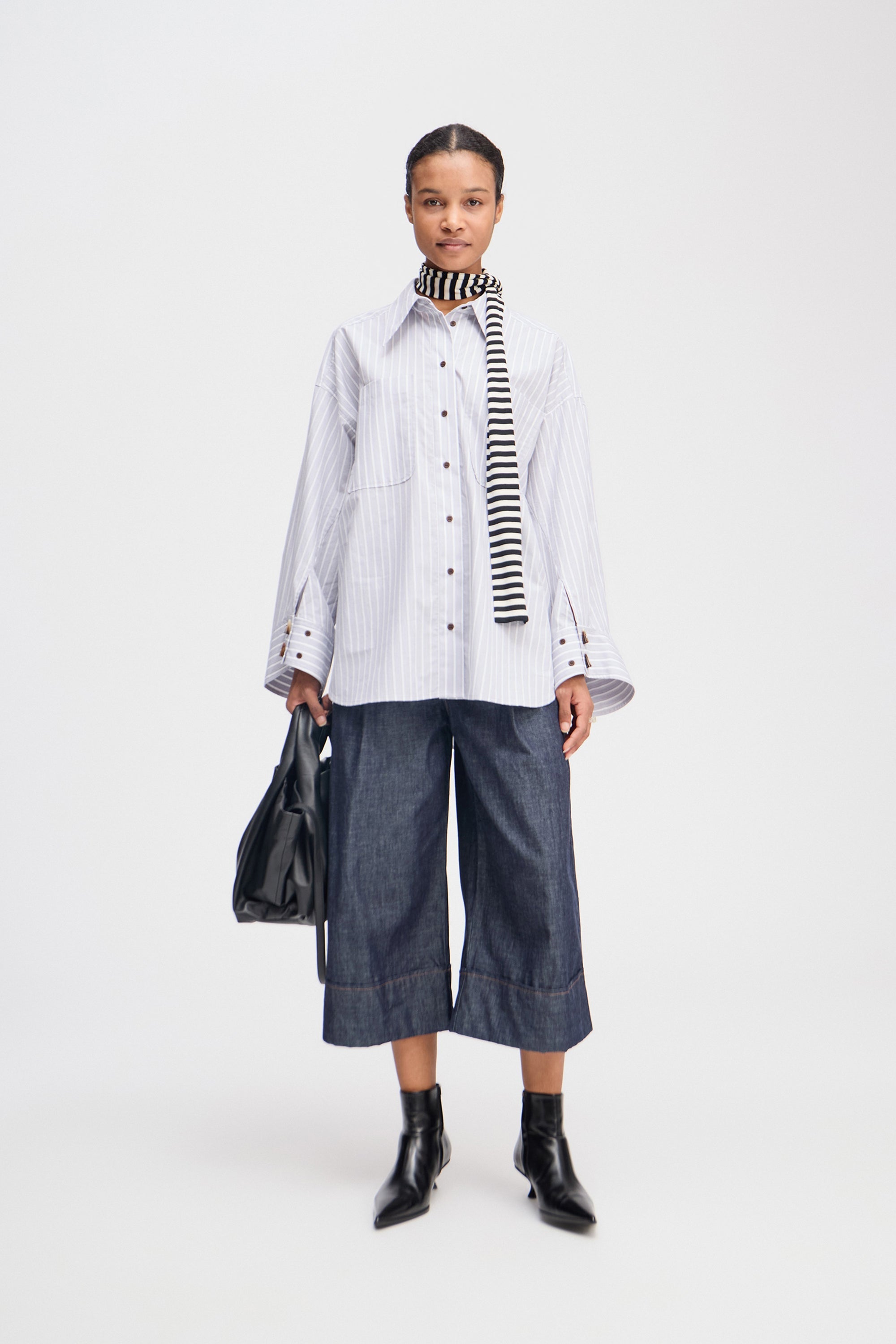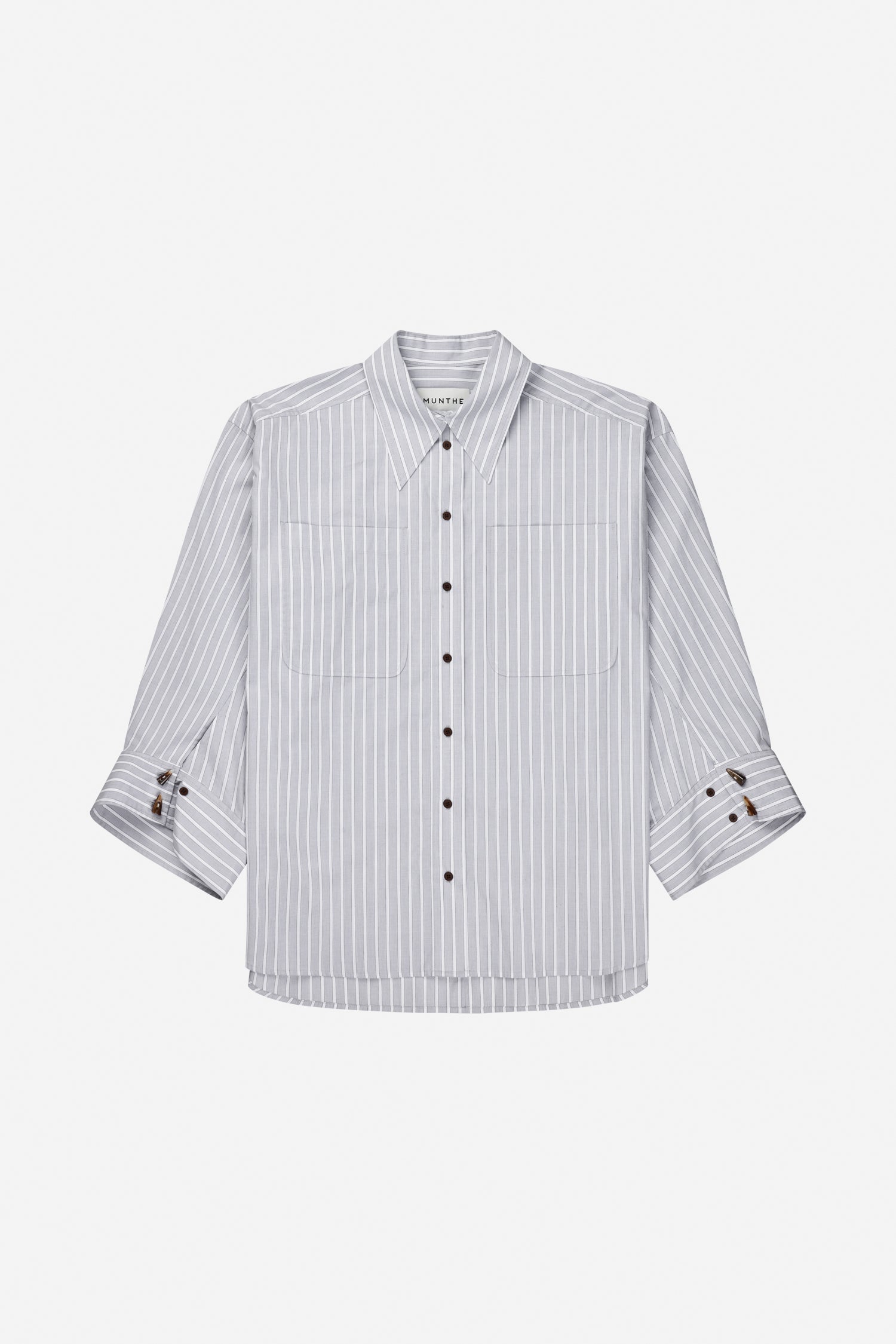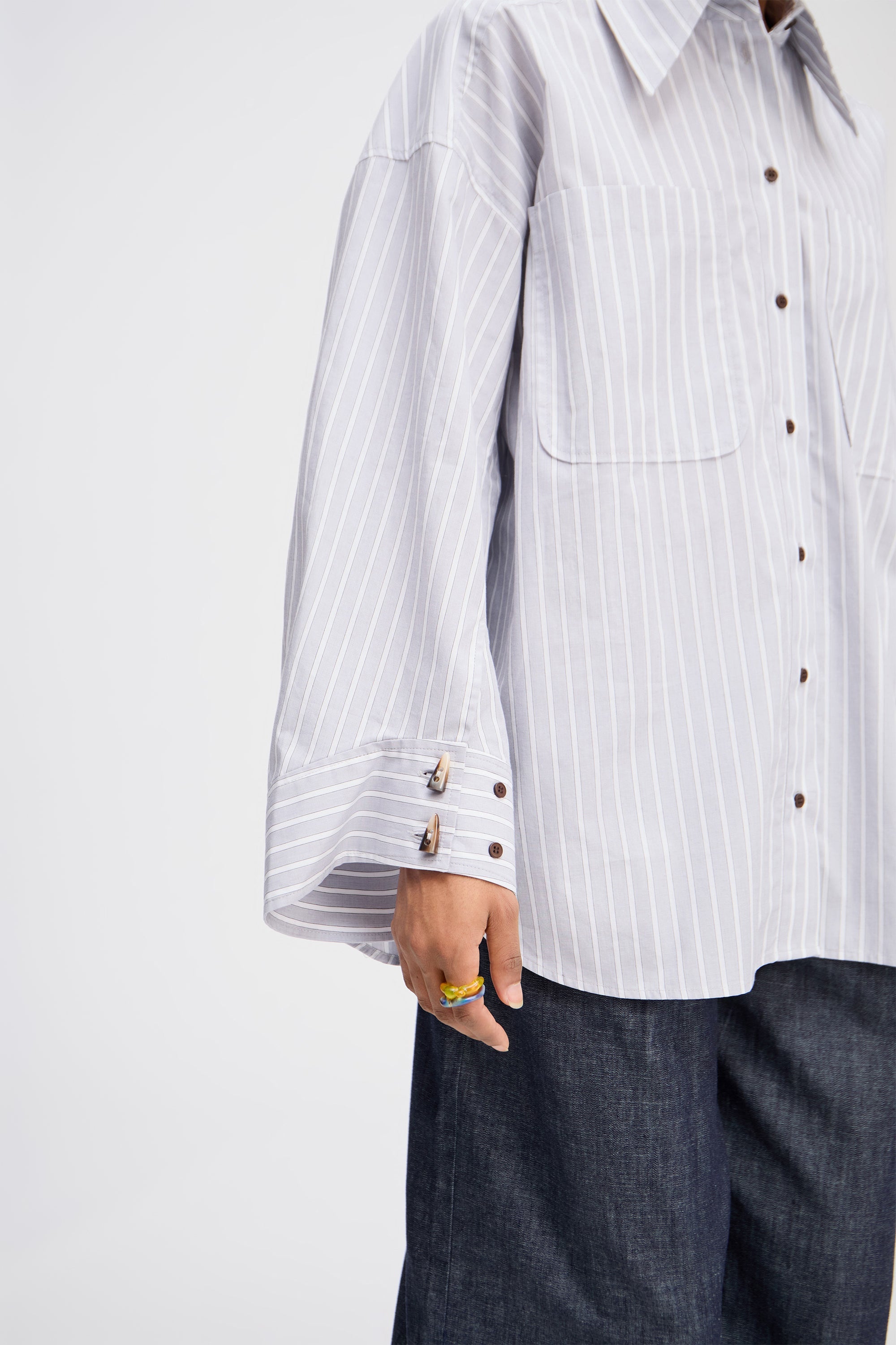 Shirt with beautiful faux horn buttons, elegant stripes, and wide, stylish cuffs. The shirt is designed to be oversized.