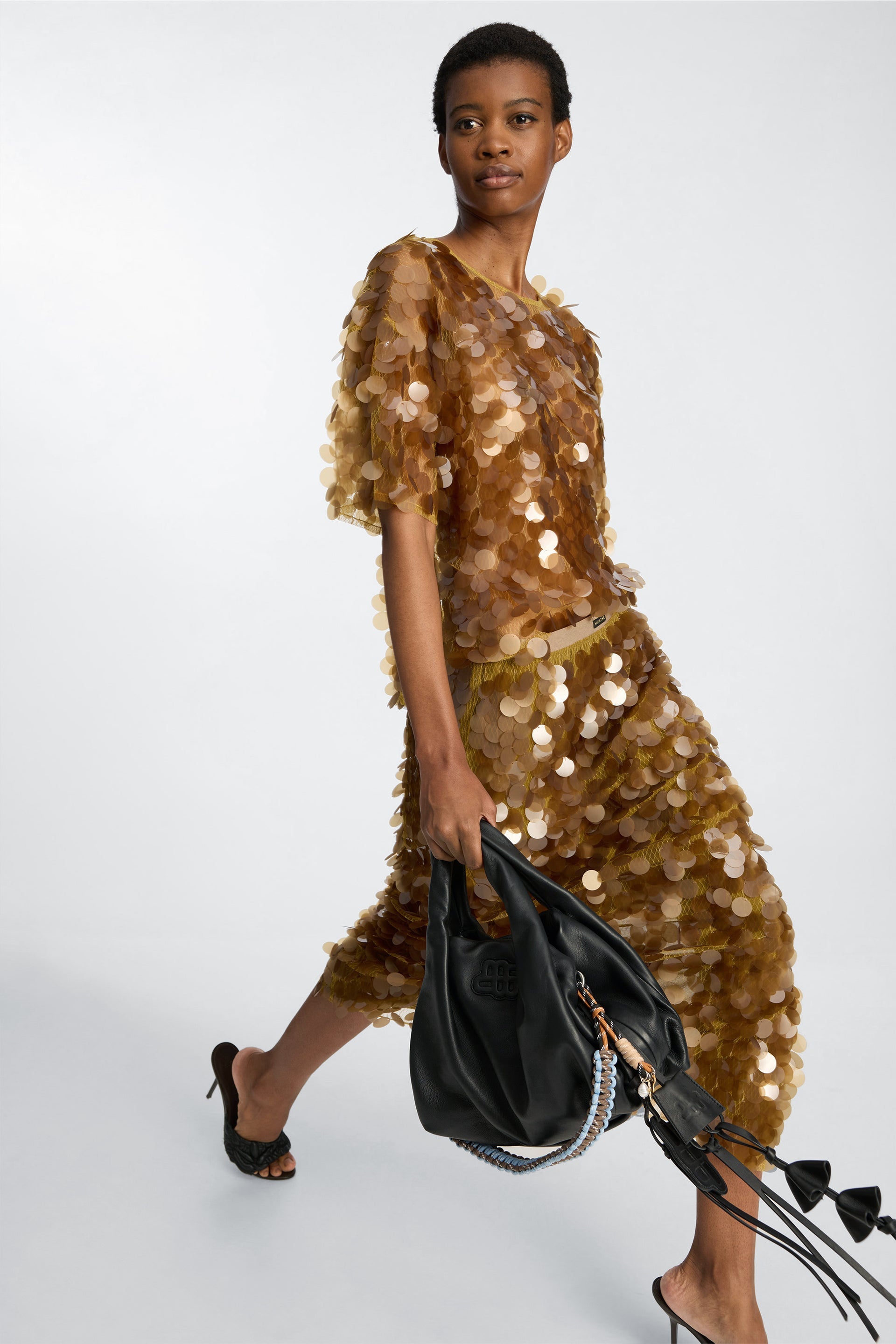 The BOMI skirt has light large sequins, and is crafted in a straight silhouette with an elastic waistband and reflective sequin detailing. A show-stopping sequin skirt that captures light with every movement - perfect for events, celebrations, or whenever you want to make a statement.