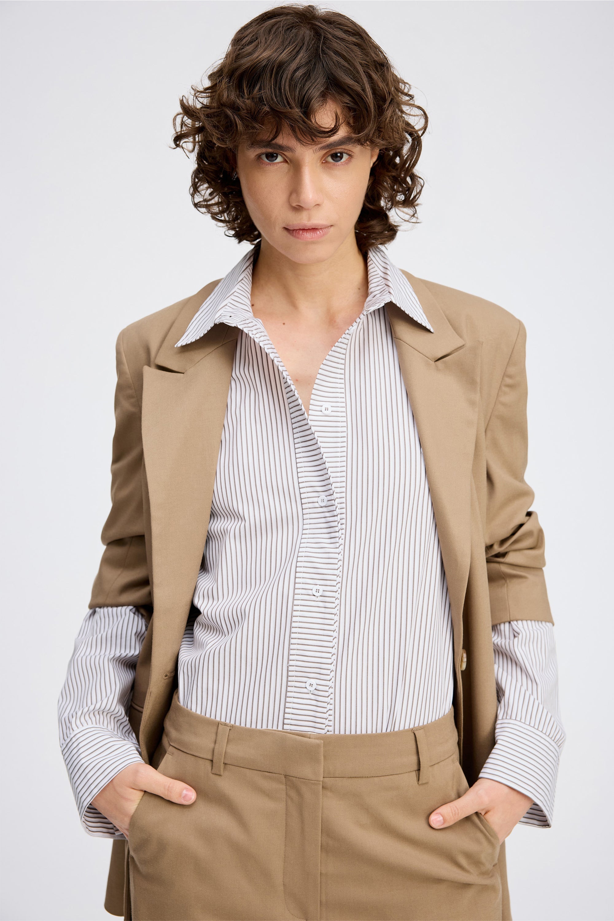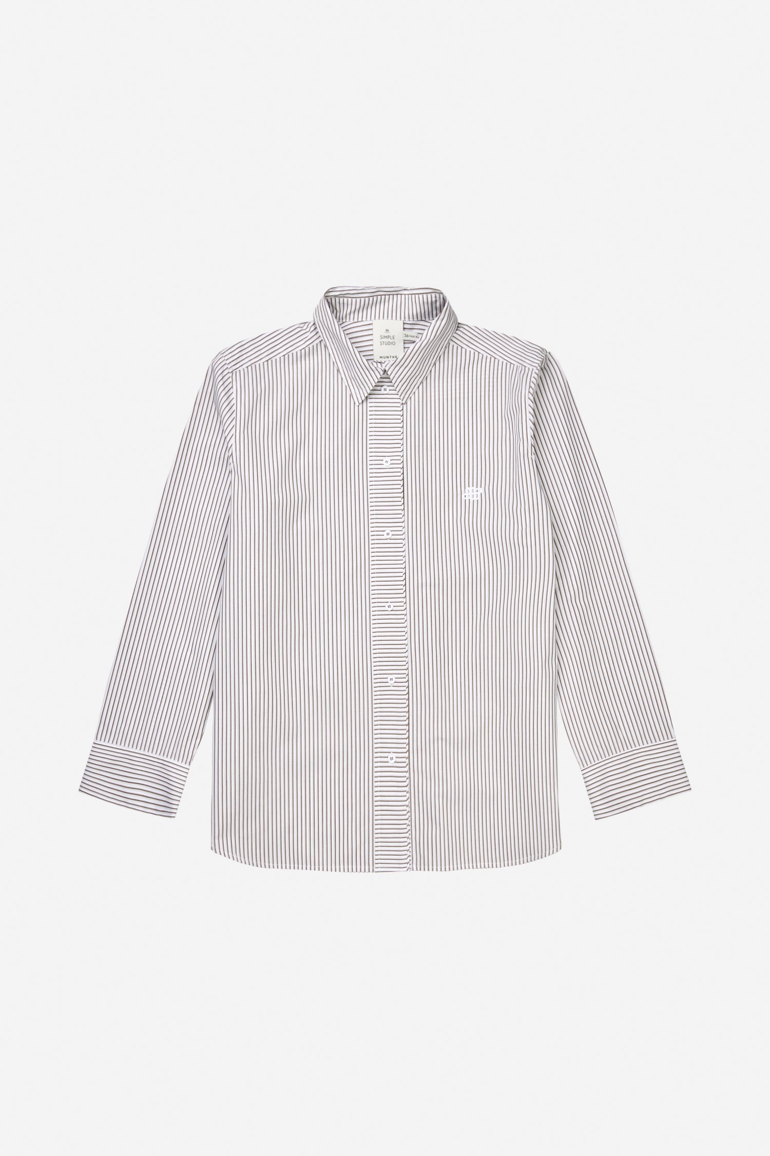 A shirt with beautiful pinstripes that are elegantly twisted to run horizontally along the button closure. This shirt features long sleeves with stylish cuffs and is designed for a loose fit.