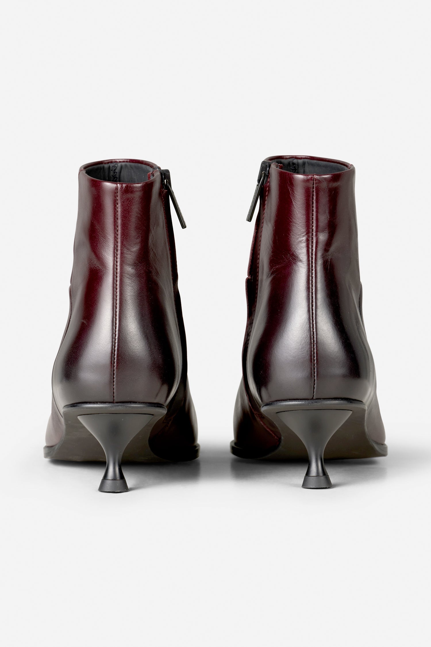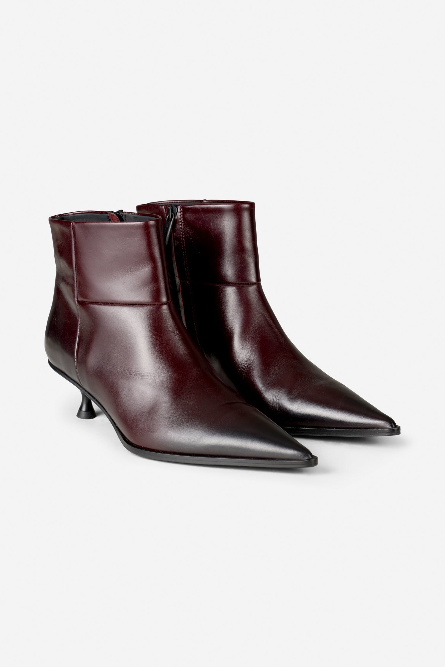 A beautiful leather boot with a pointed toe and low heel. It has a lovely burgundy tone that transitions into a darker shade at the toe and heel of the shoe. The shoe is closed with a zipper on the side.