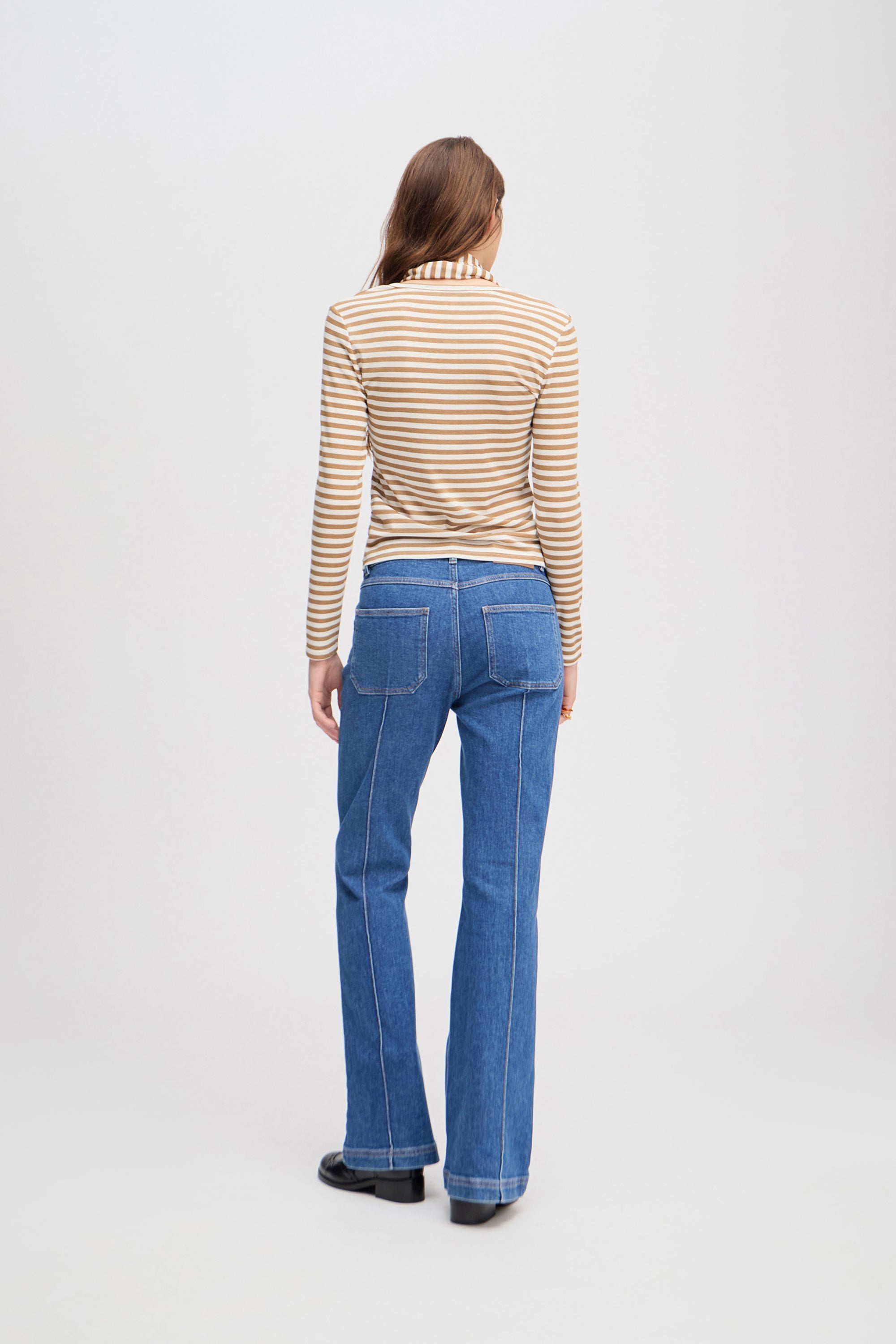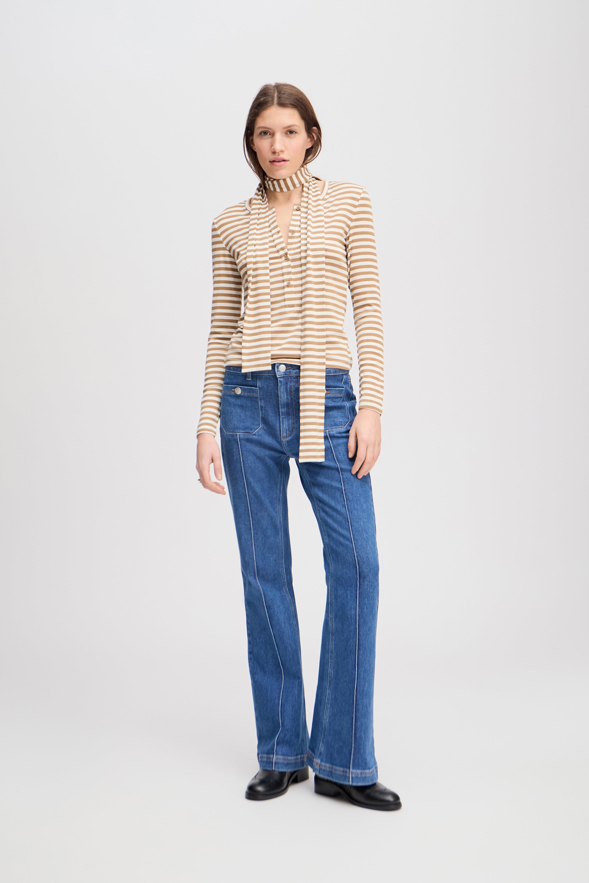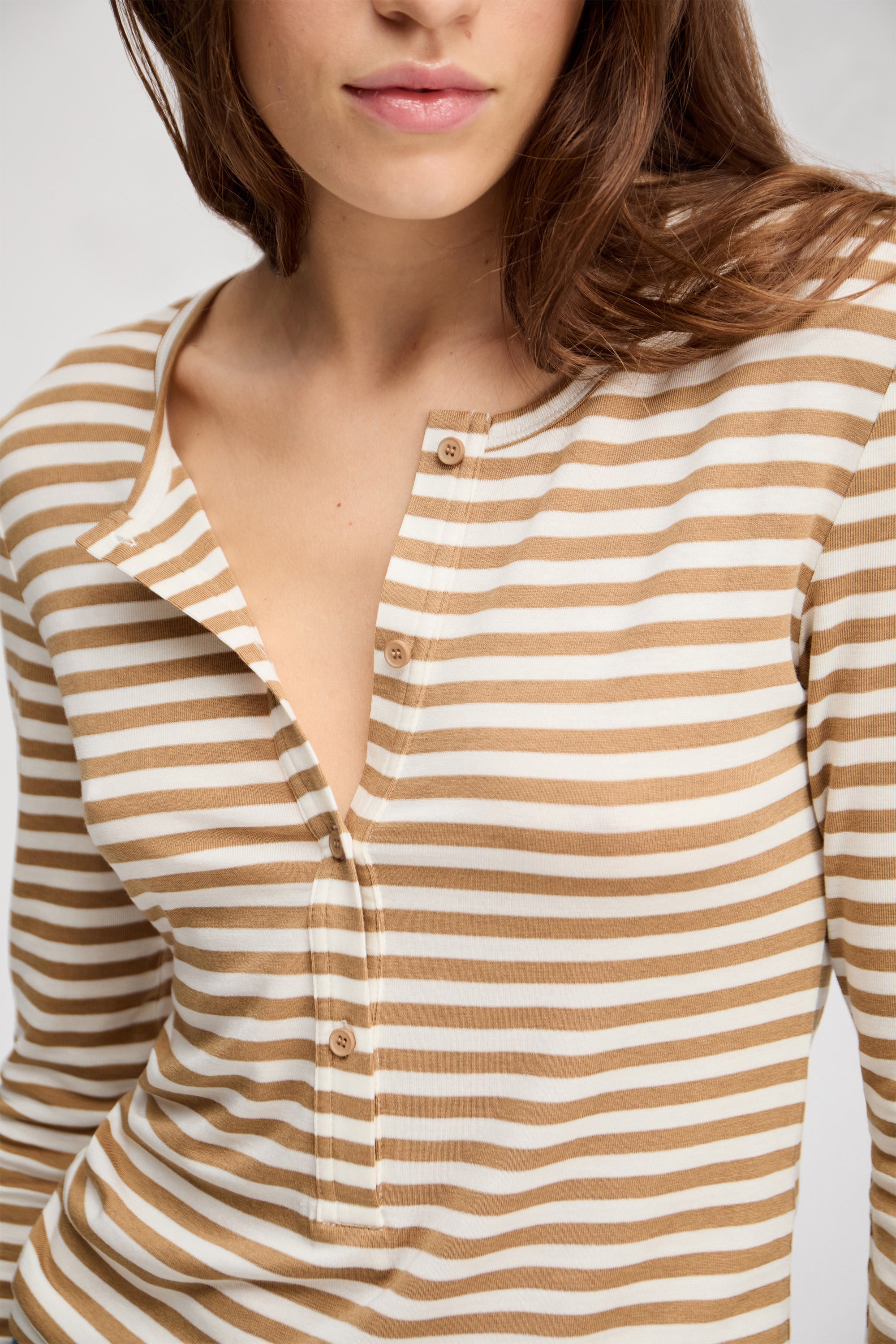 Soft T-shirt with fine, narrow stripes and an elegant button closure. The T-shirt is designed with black buttons, a round neckline, and long sleeves.