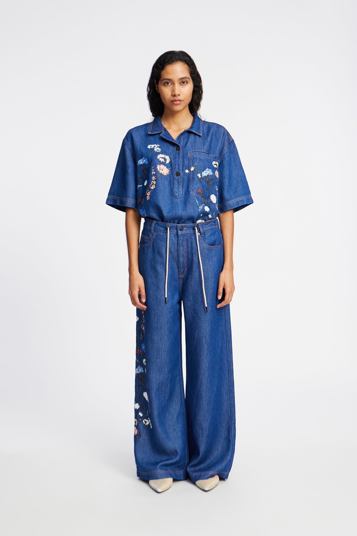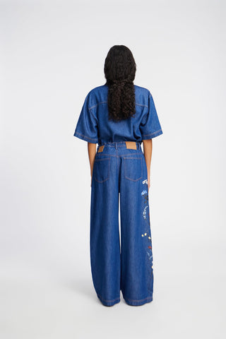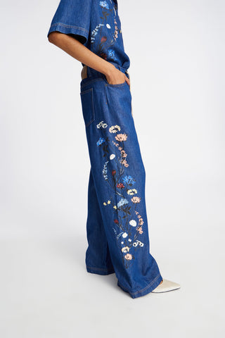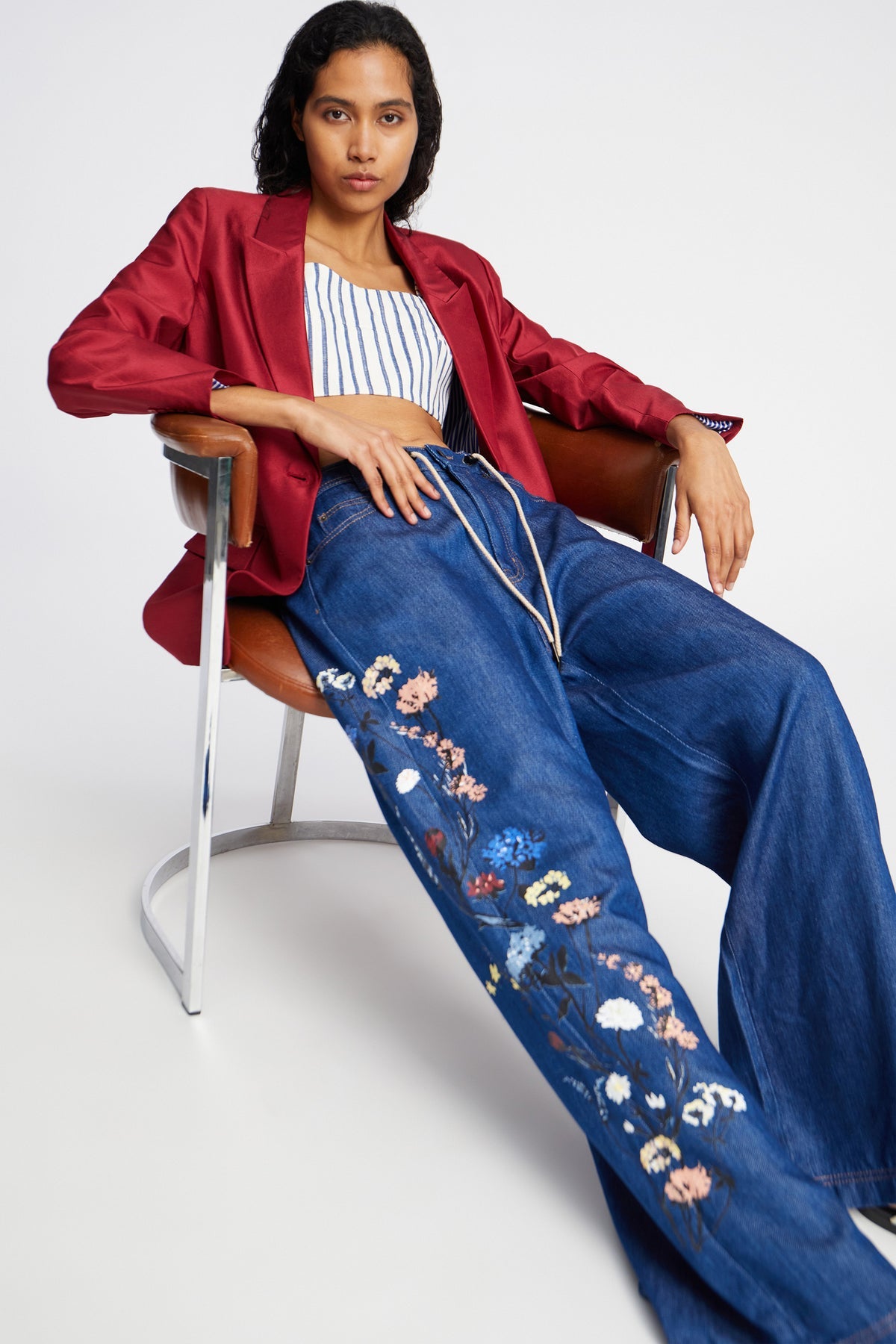 Dark blue jeans, designed with a beautifully painted floral print. These jeans have an elegant drawstring detail at the waist, a loose fit, wide legs, and are designed with front and back pockets.