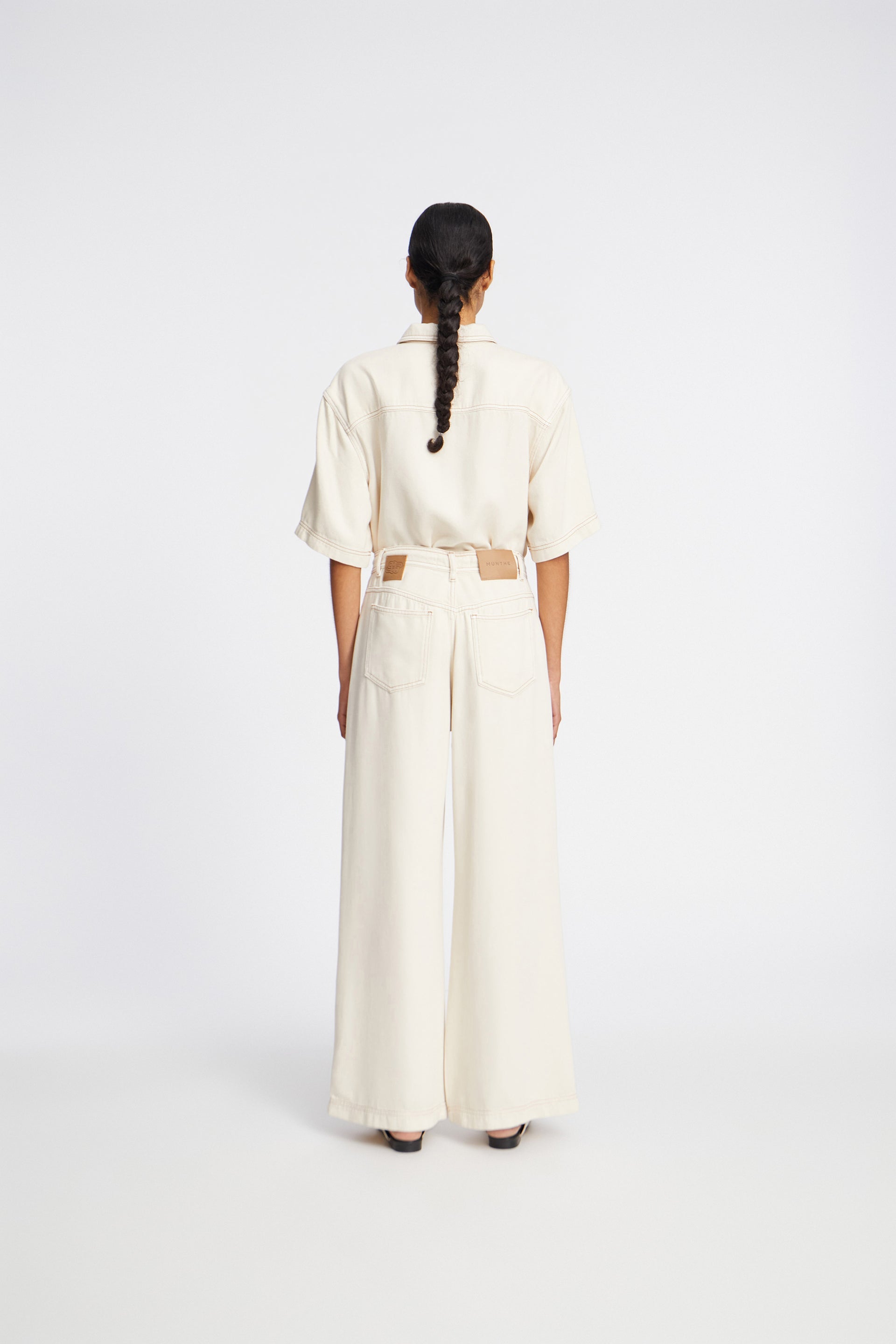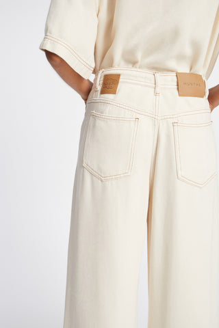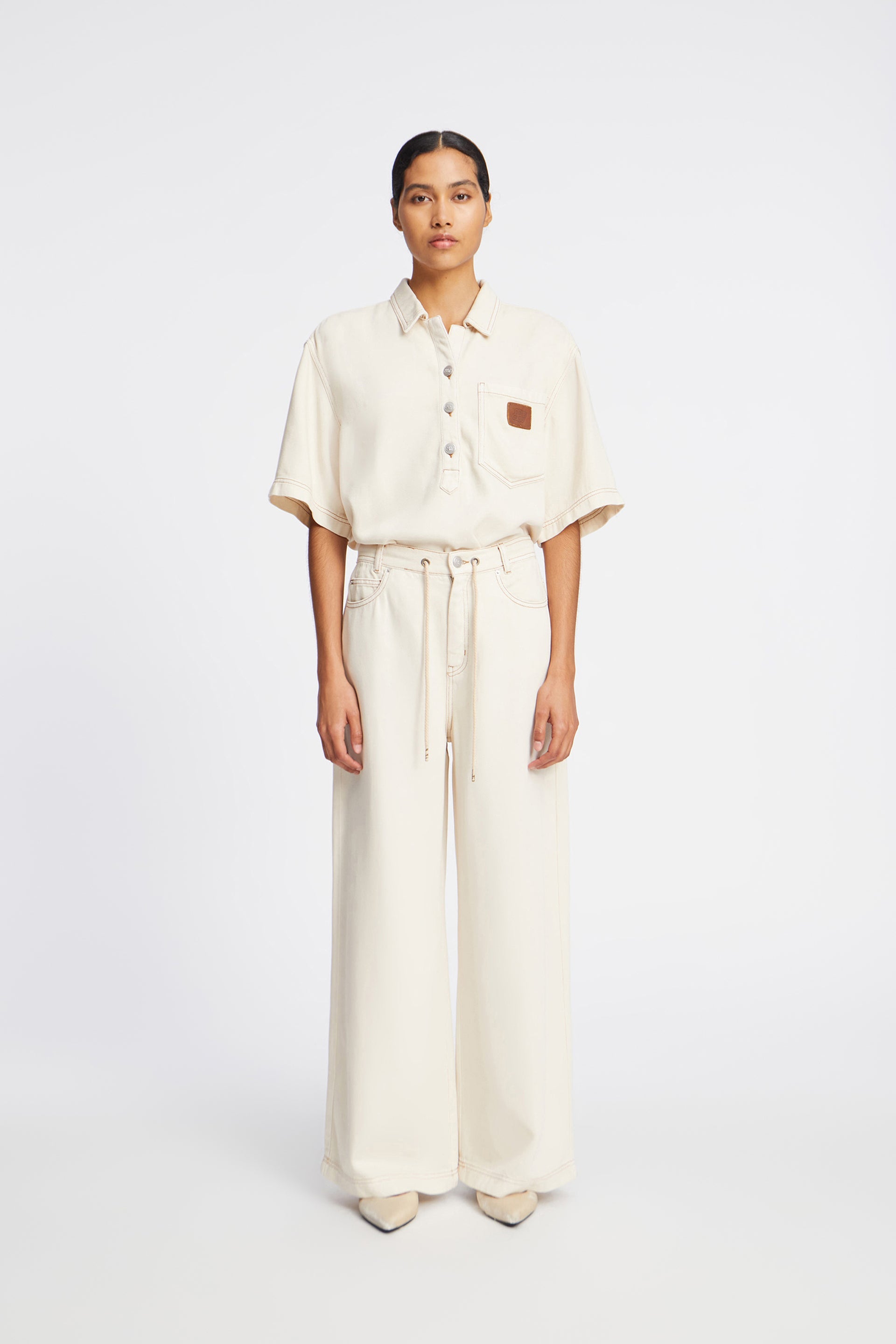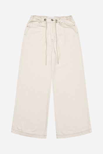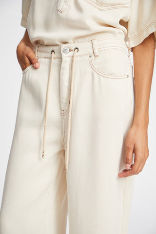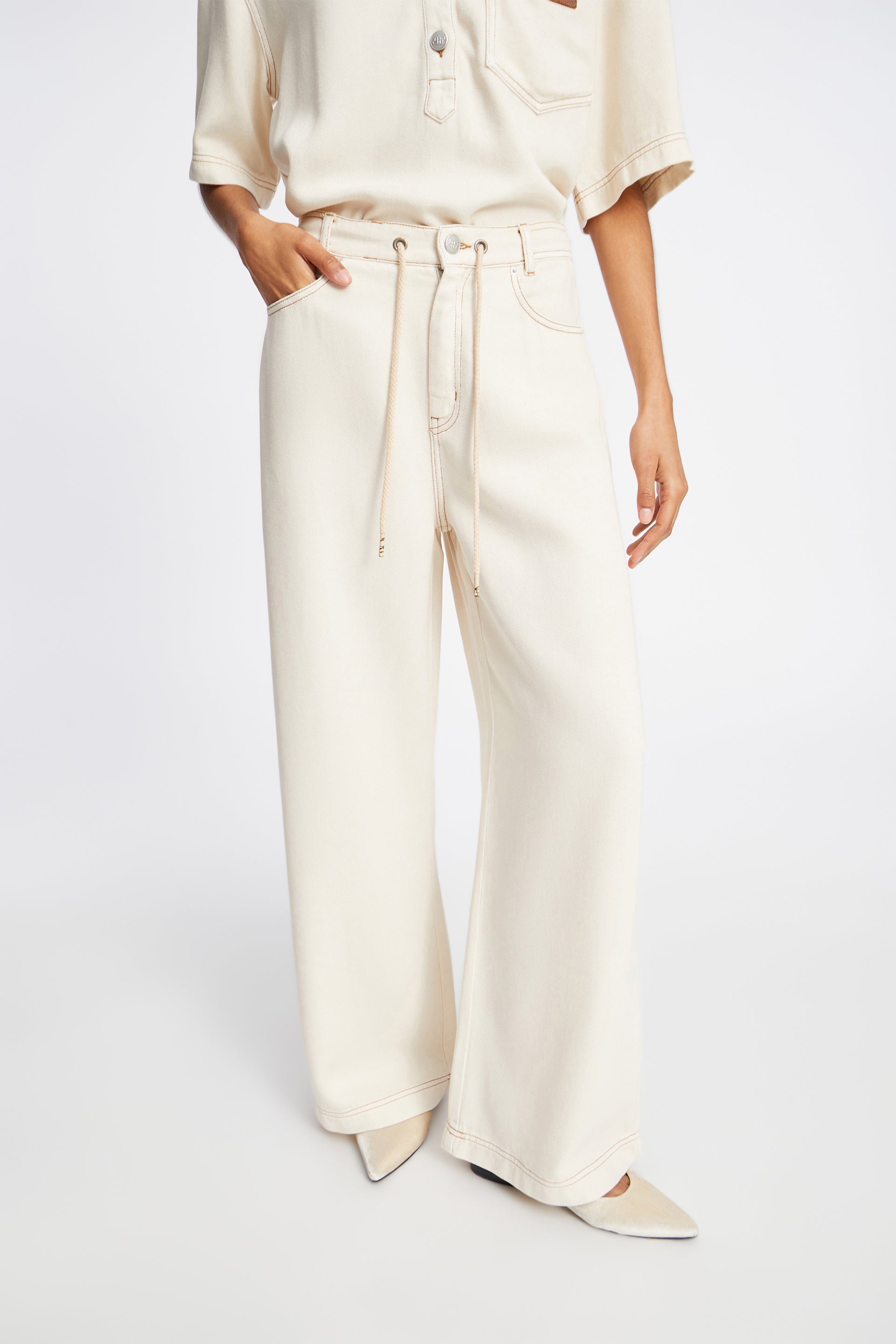 Light, beautiful jeans are designed with an elegant lace-up detail at the waist. These trousers feature a loose fit, wide legs, and pockets both at the front and back.