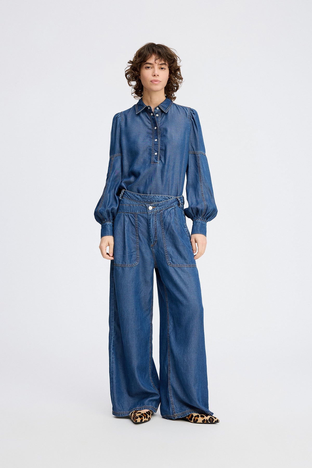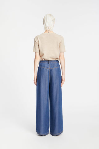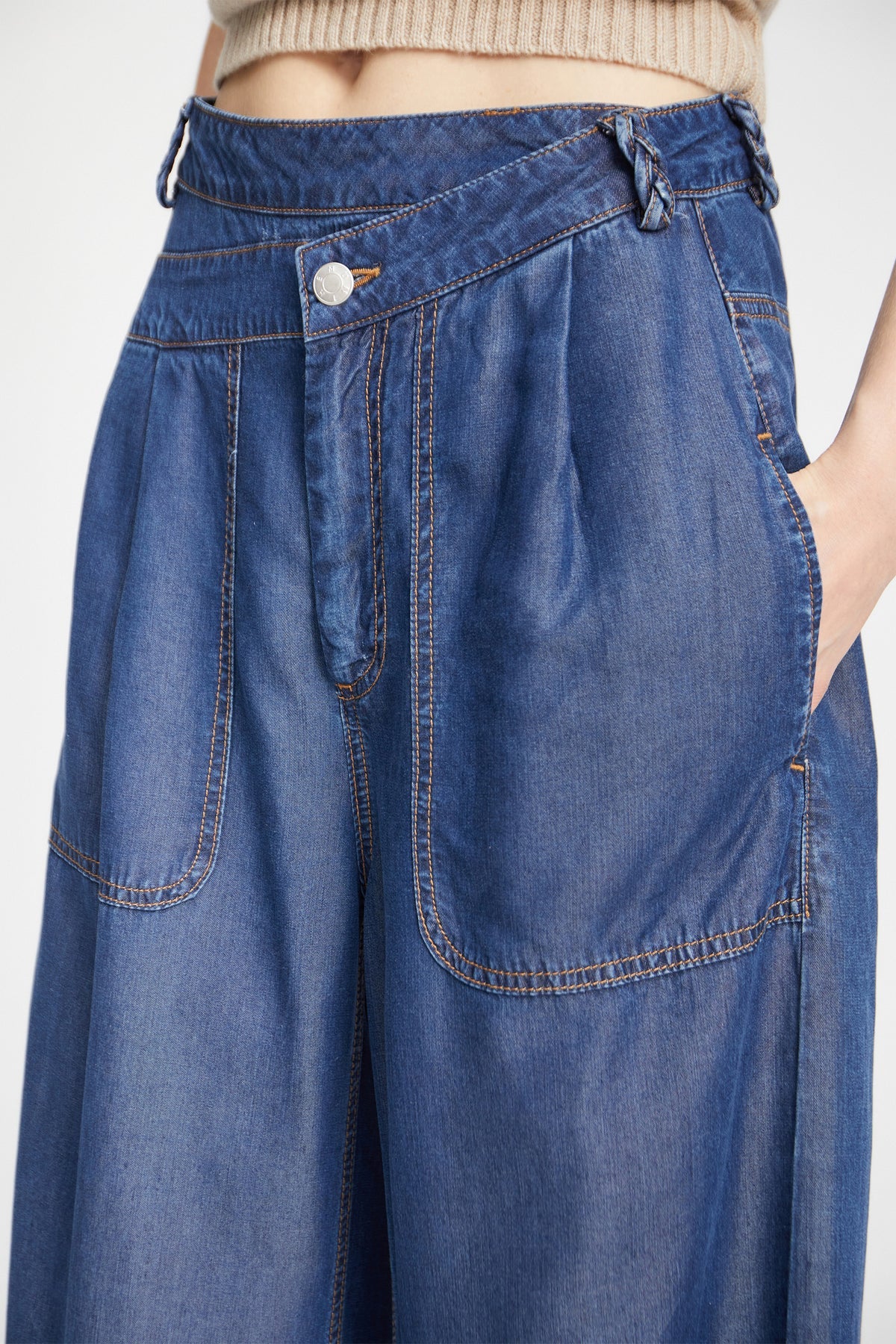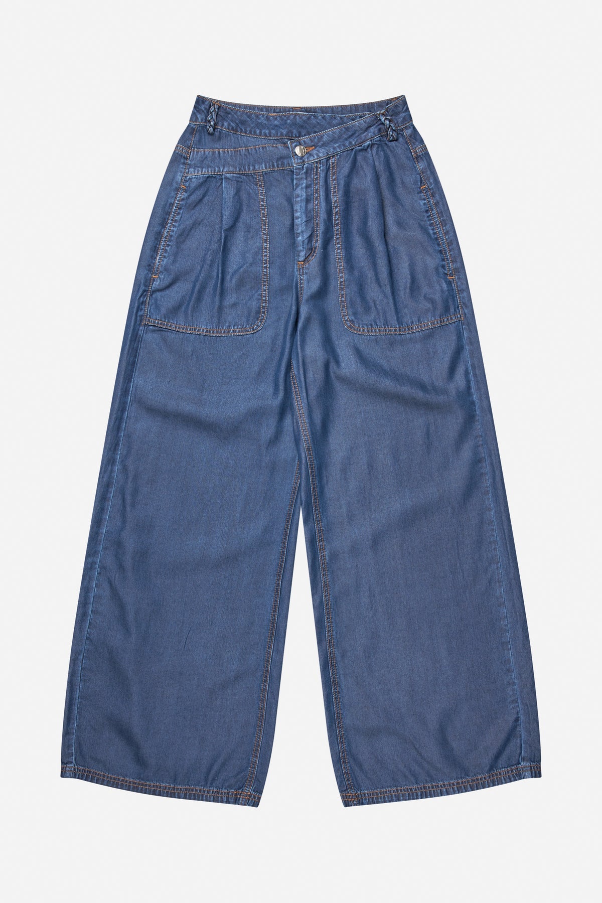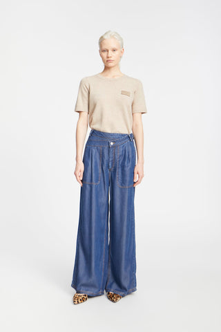Denim trousers with an elegant double waistband twist. These trousers are designed with orange stitching and feature a loose fit with side pockets. The trousers have a fitted waist and wide legs.