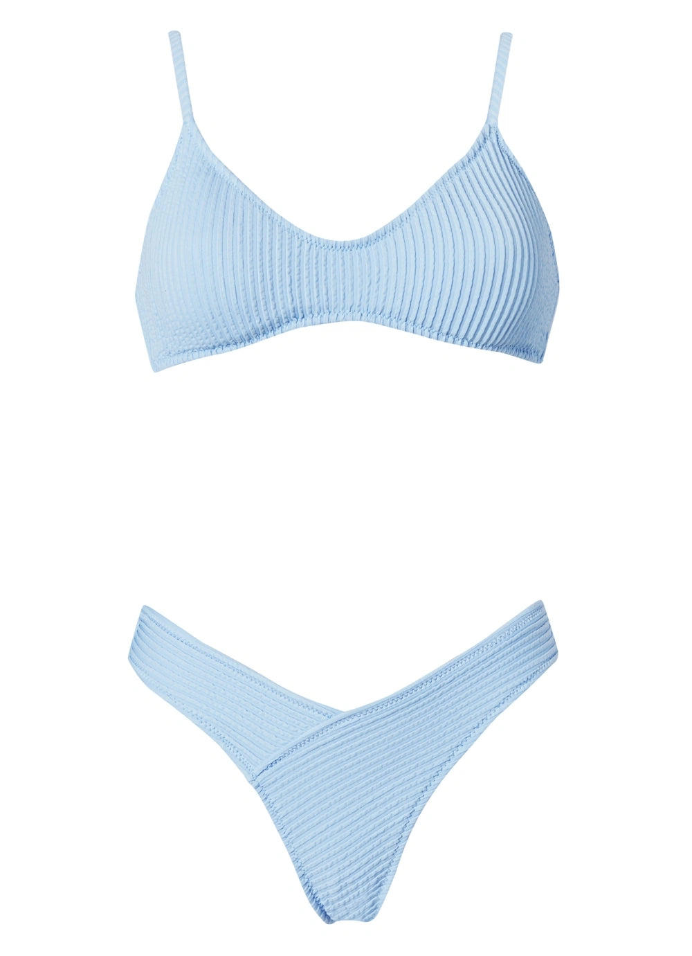 This bikini has a scooped neckline, adjustable shoulder straps and light padding. Flattering V-cut waistline at bottom.