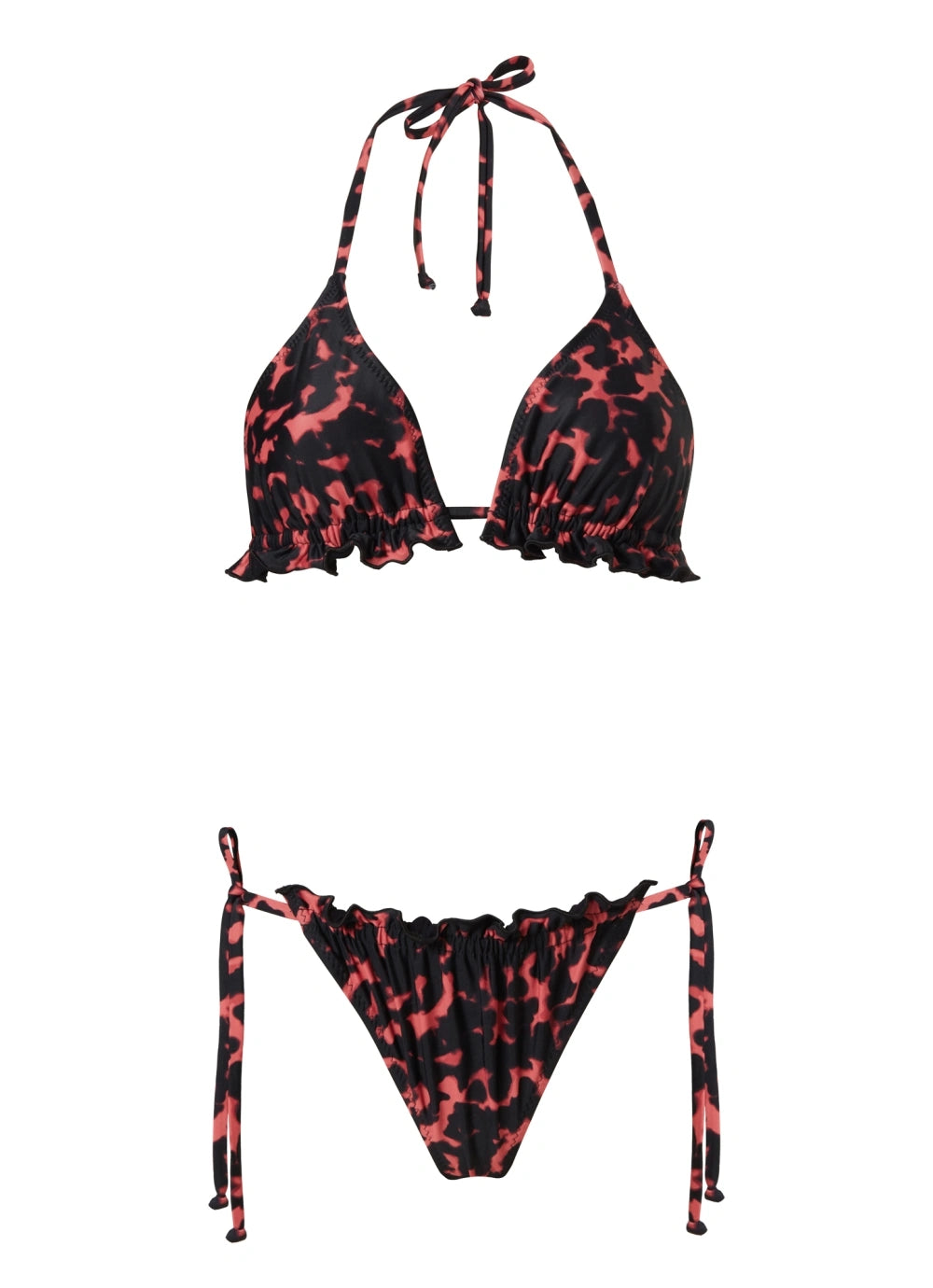 Triangle frill bikini with removable light padding at top and adjustable ties. Excellent fit.