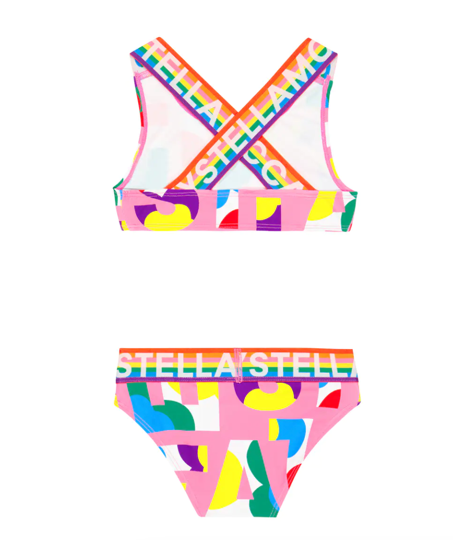 Stella McCartney Kids designs clothing for everyday adventures with vibrant colors and imaginative prints showcased on consciously crafted fabrics. This bikini, for example, features a colorful logo pattern and rainbow accents.